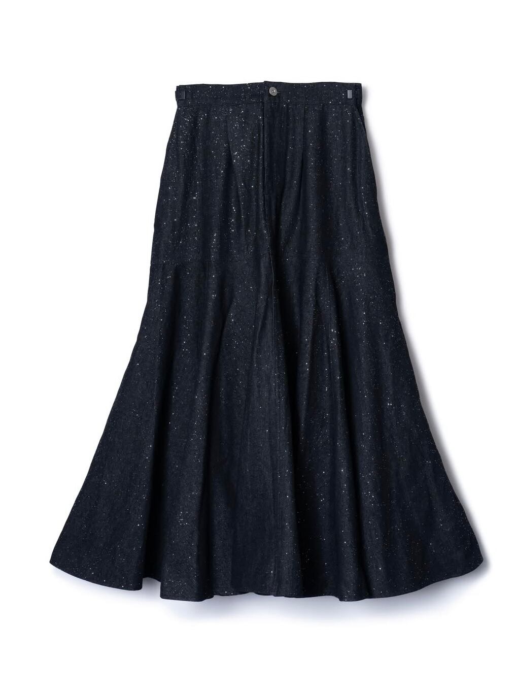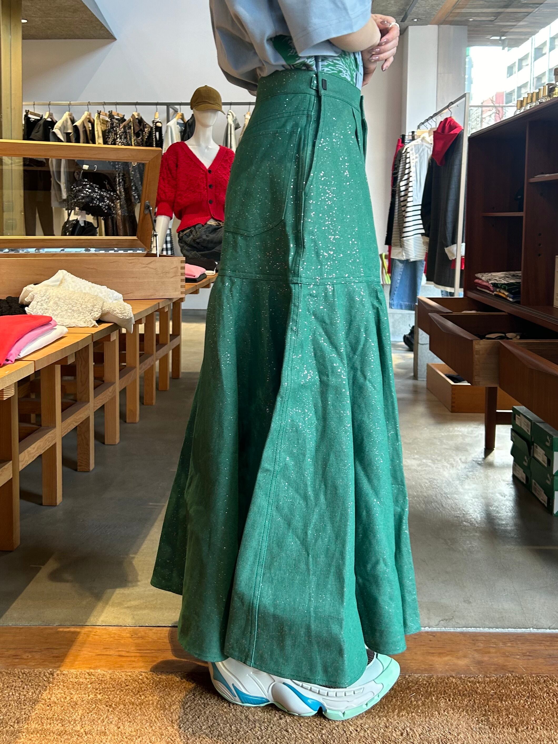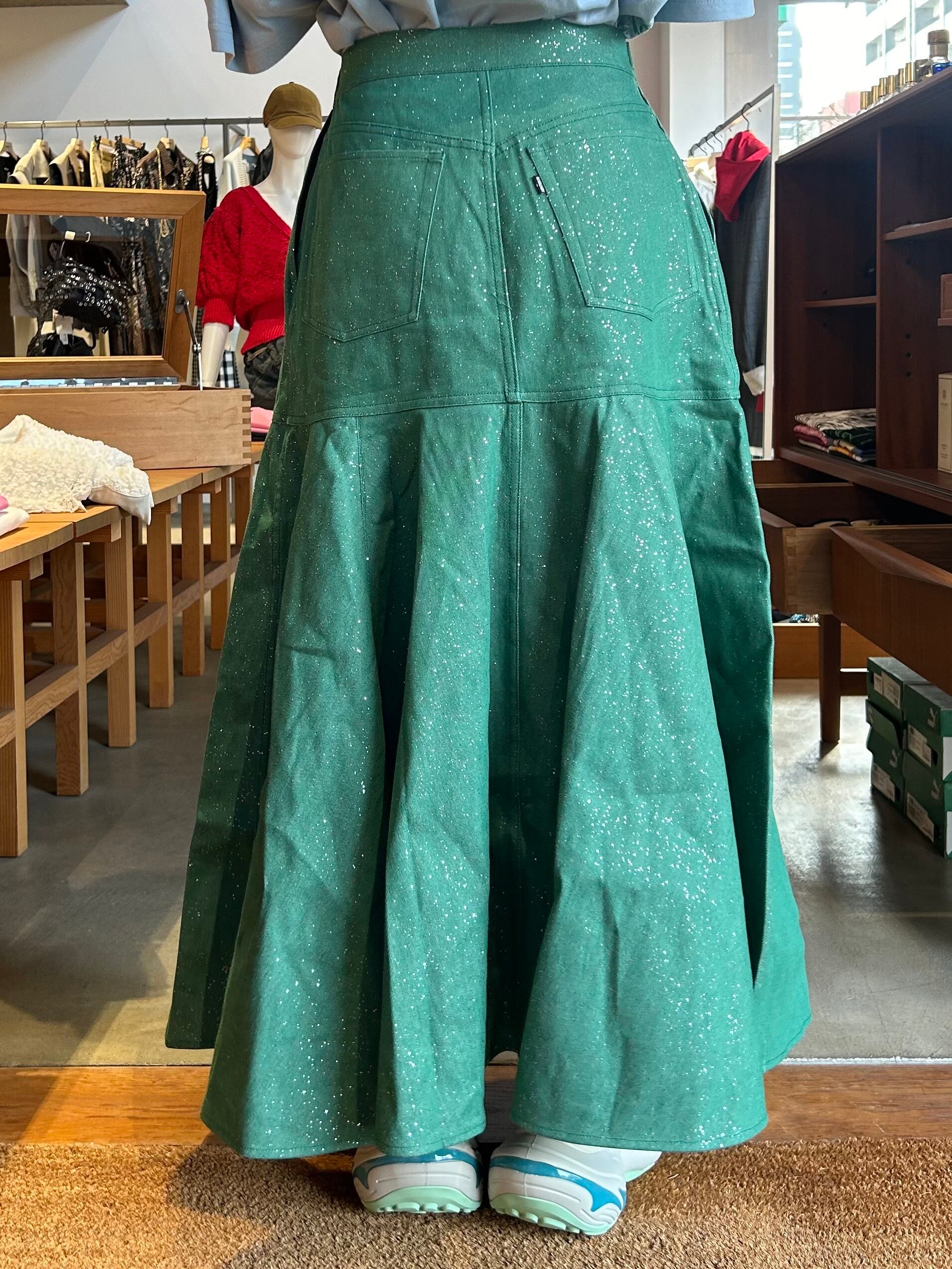 ラメ加工を施したフレアデニムスカート。