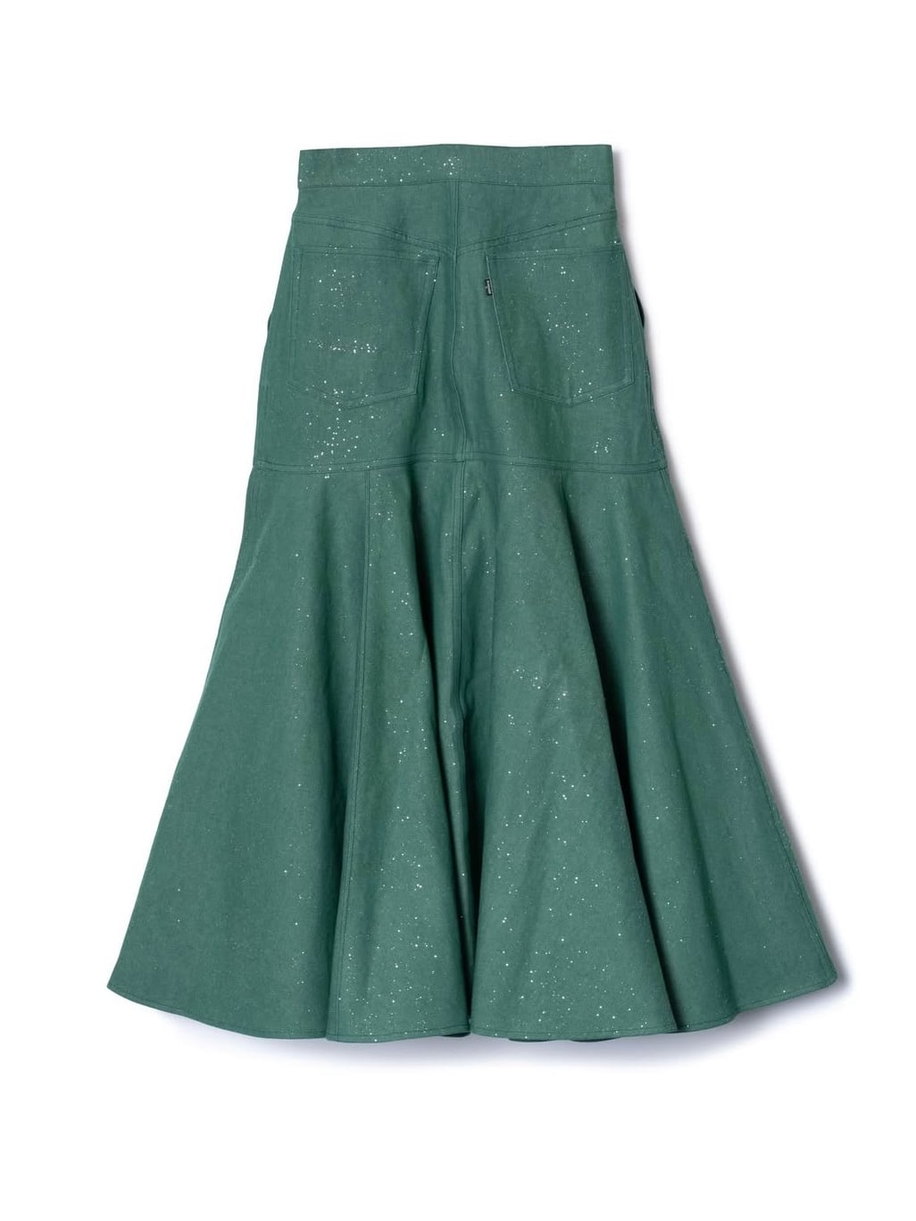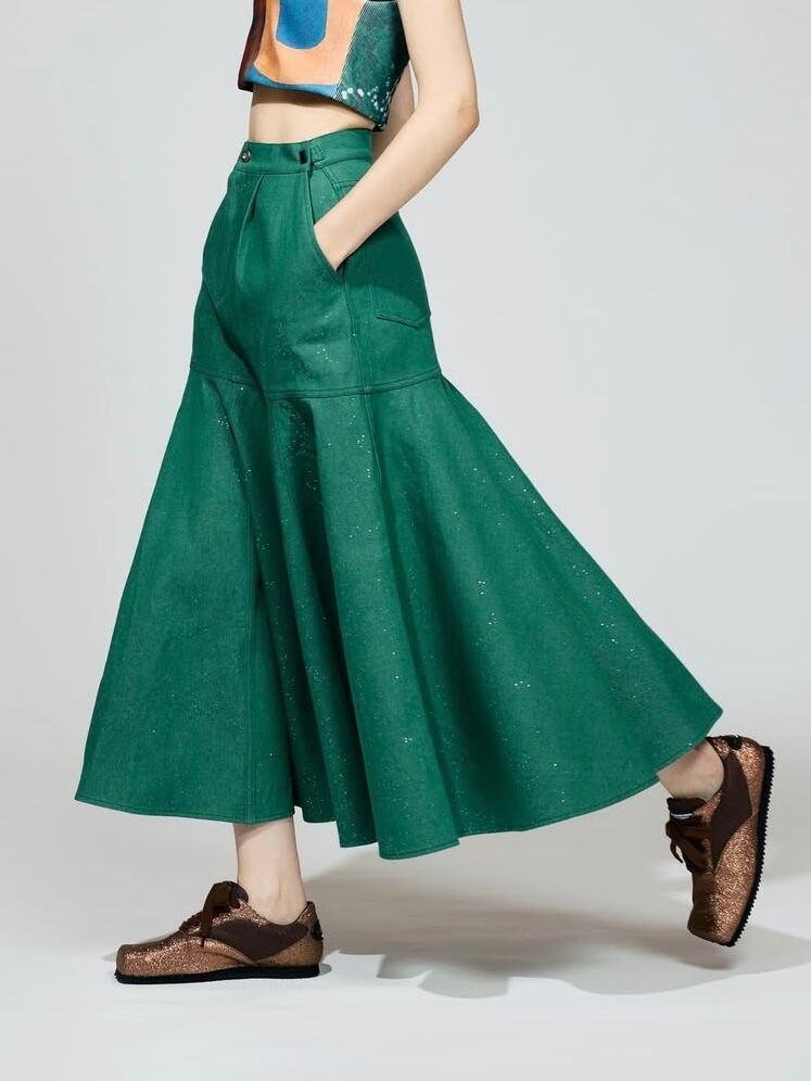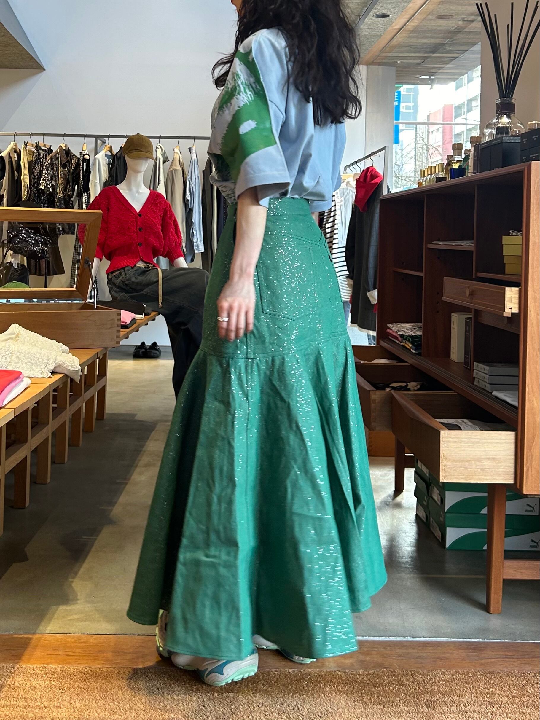 ラメ加工を施したフレアデニムスカート。