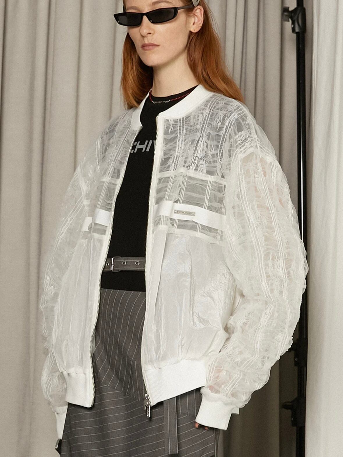 チュールとレースを重ねてシャーリングを施したマテリアルを使用し、ワッシャー感のある薄手のナイロン素材とのコンビネーションで生地の表情が魅力的な一着。