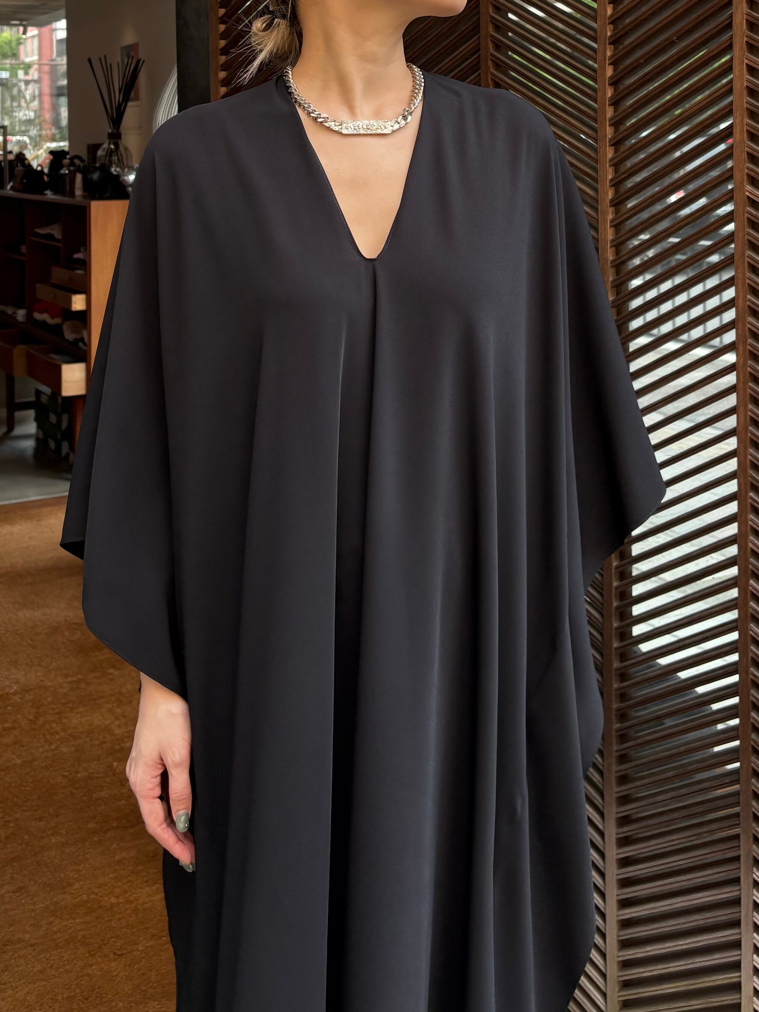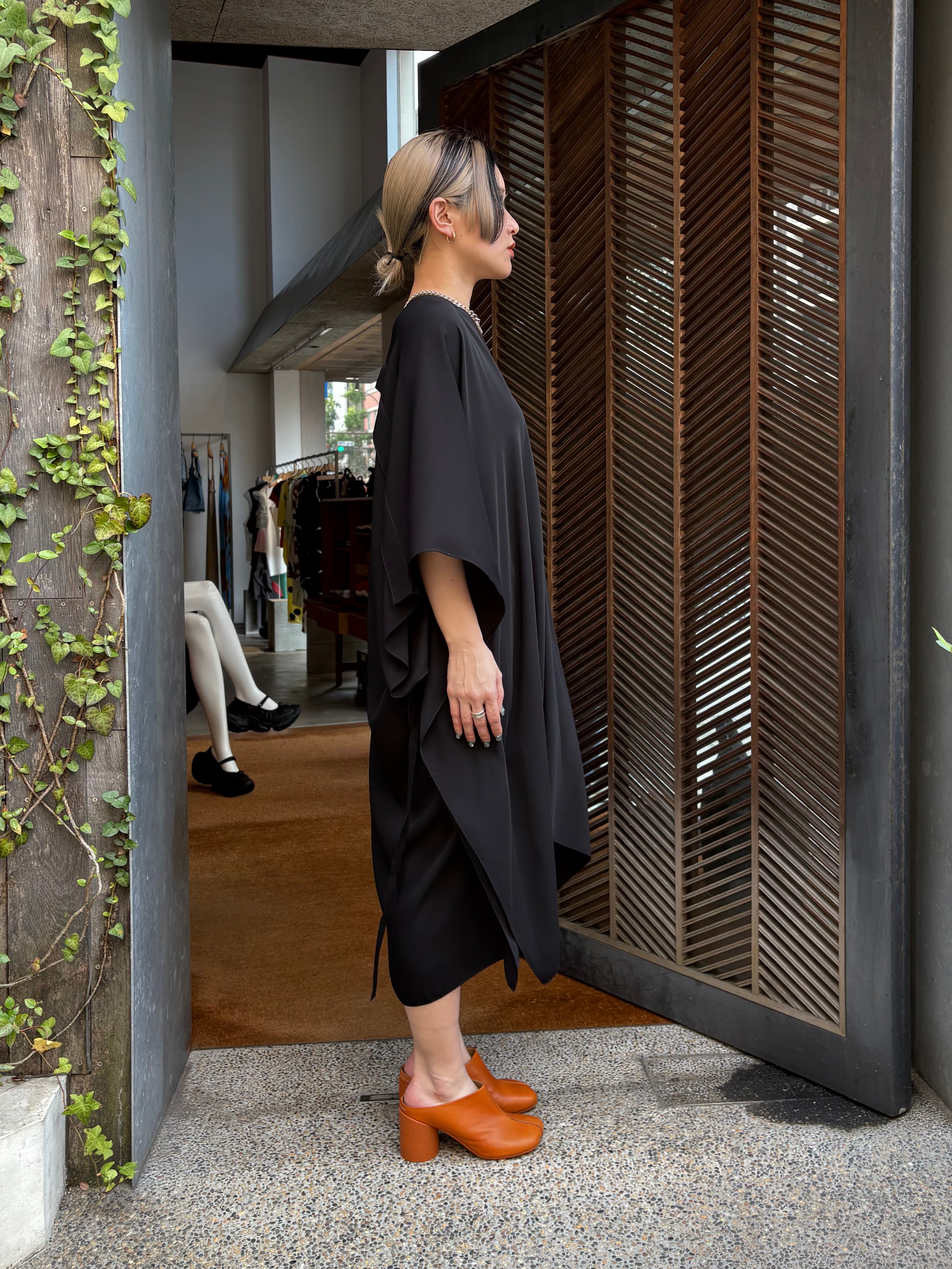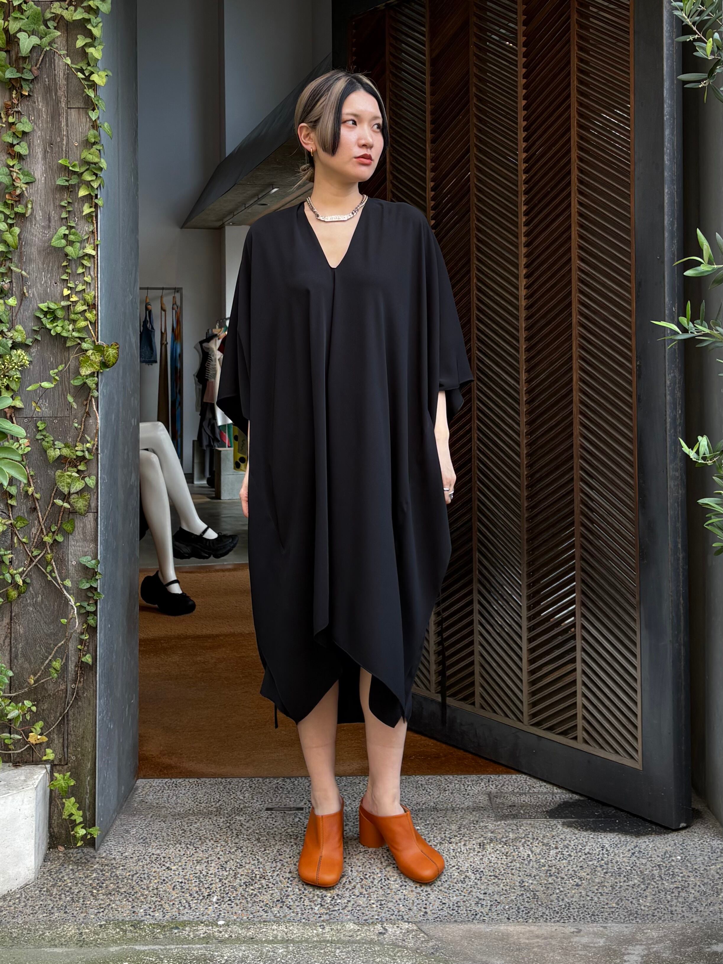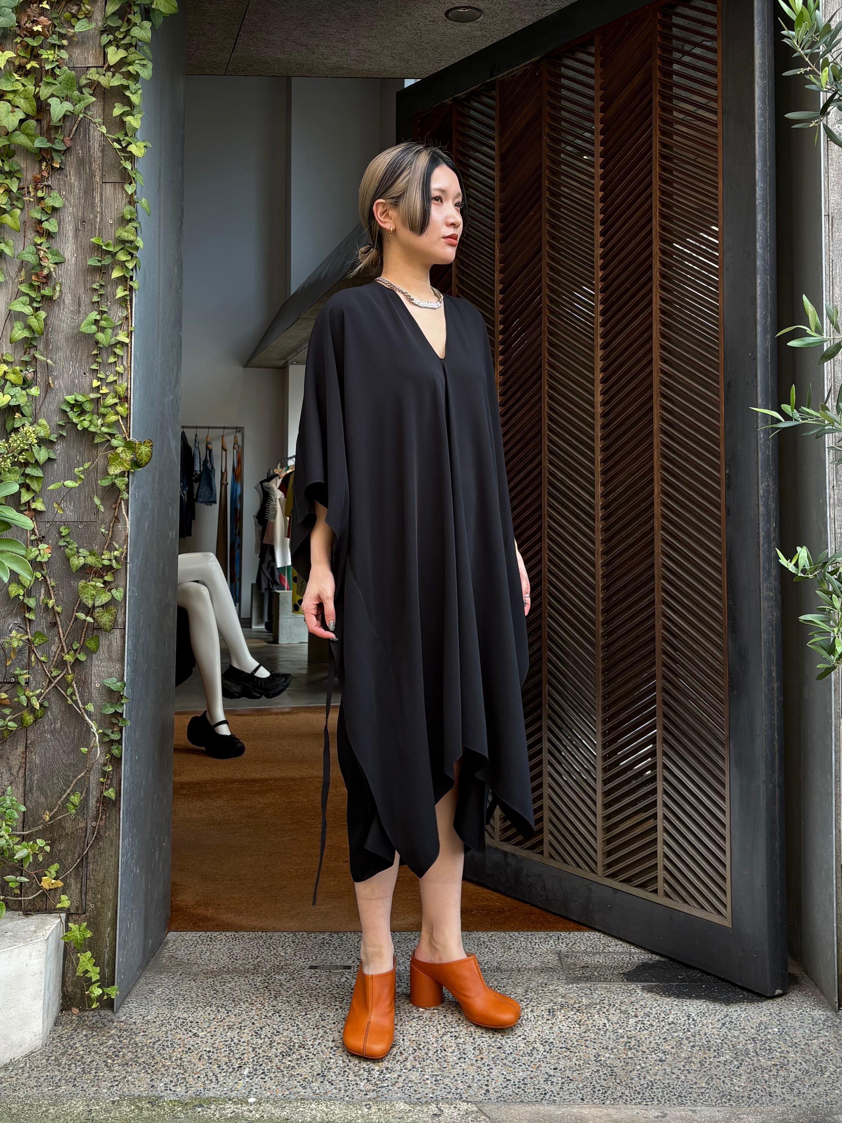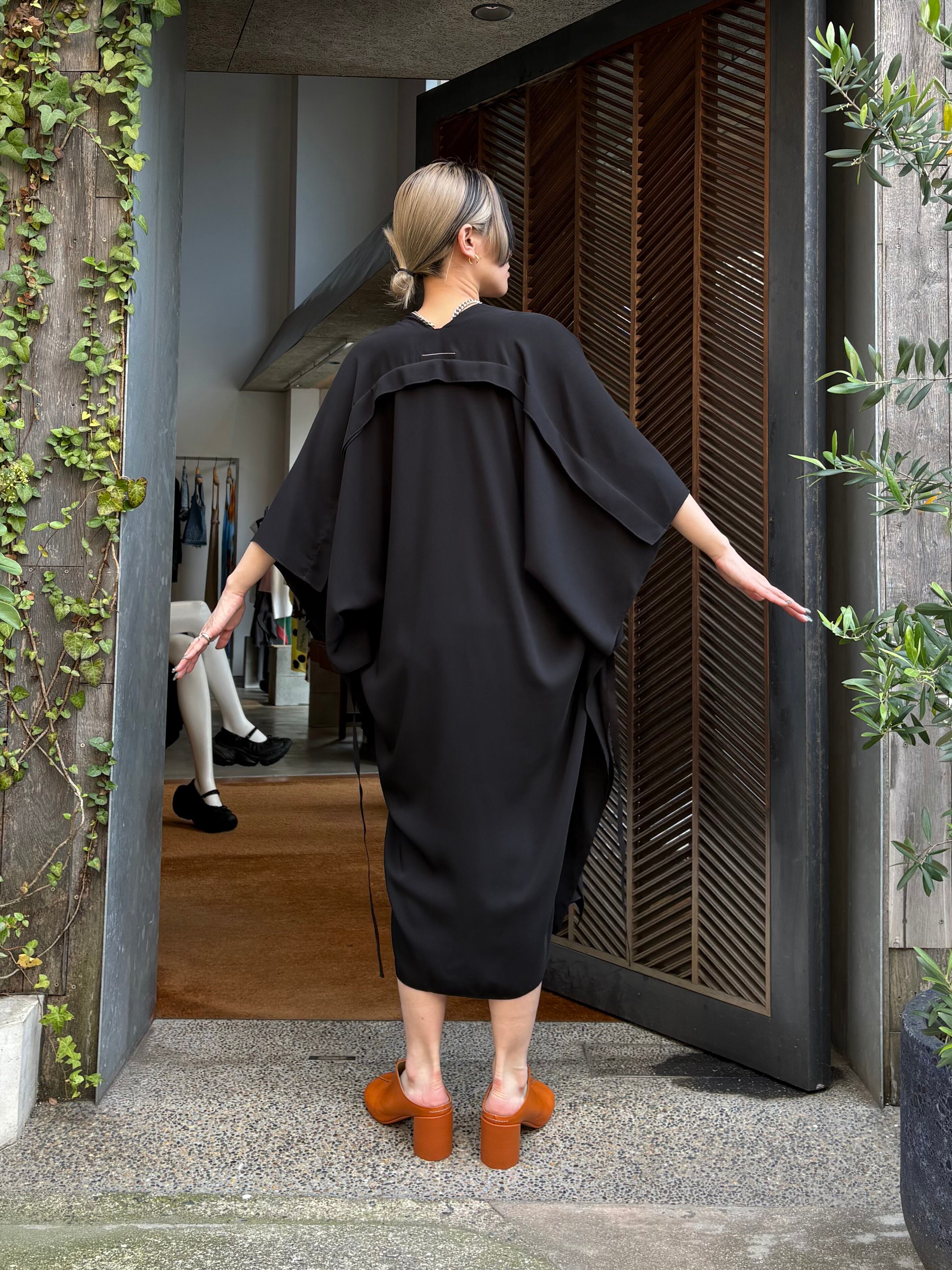 流れるような動きと緻密なカッティングが共存するミディドレス。