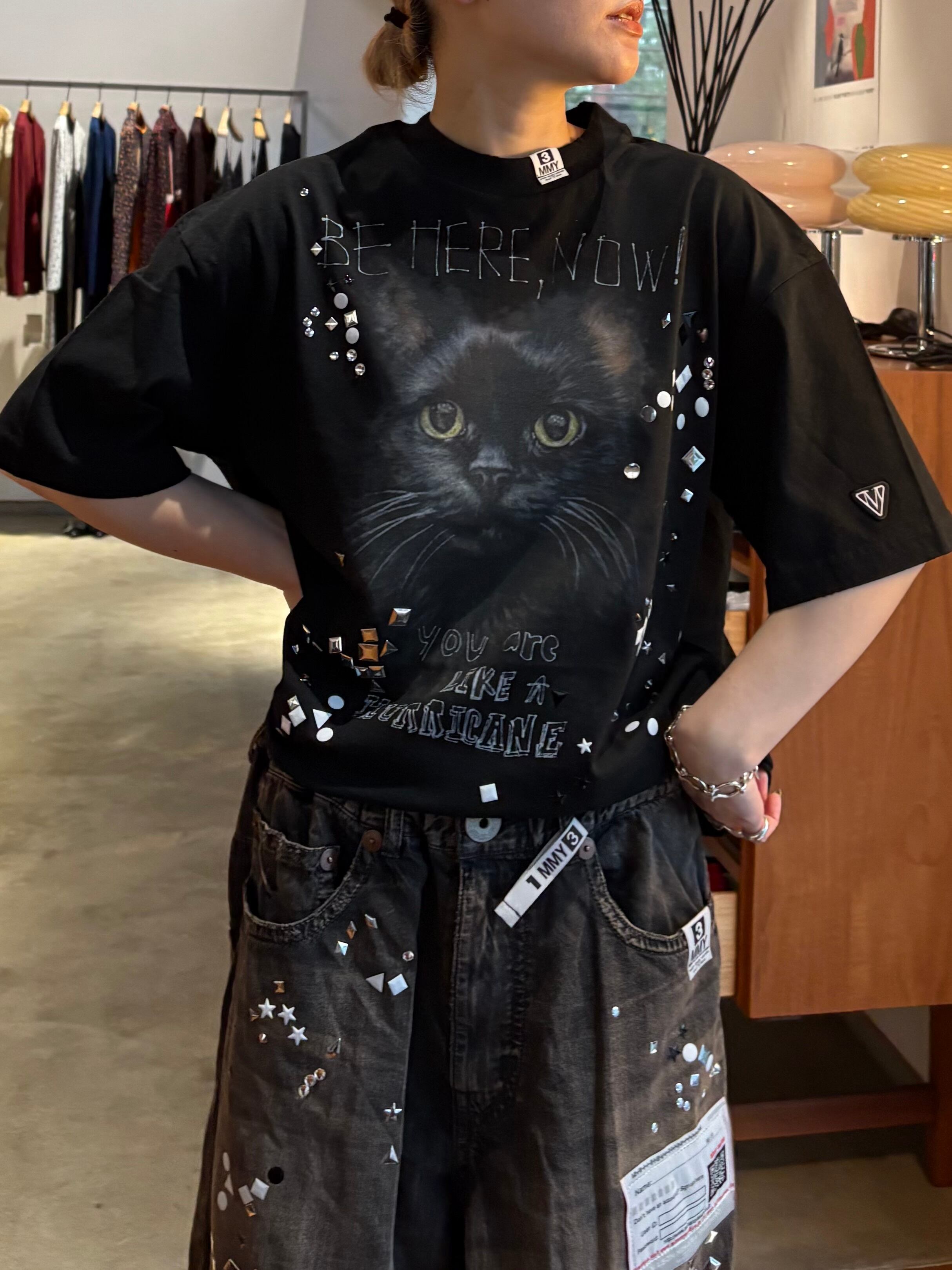 キャットプリント エンベリッシュド ディストレスト Tシャツ