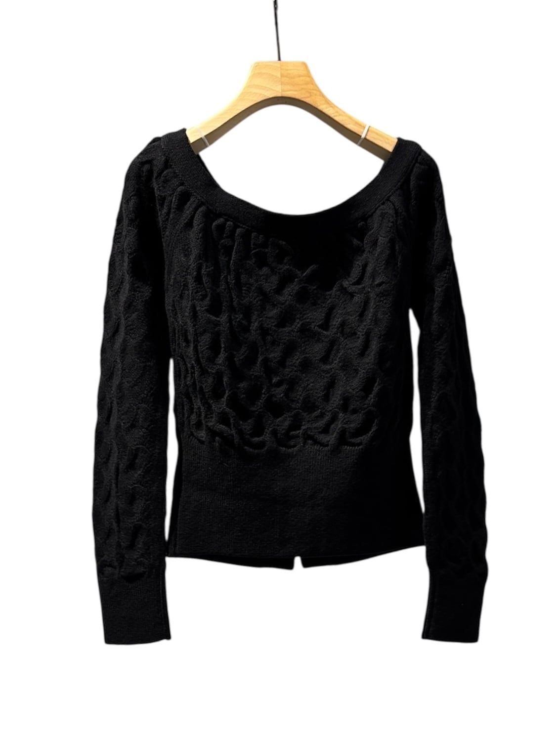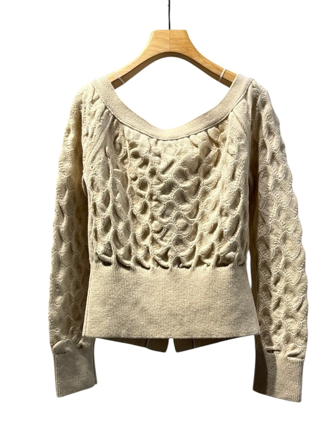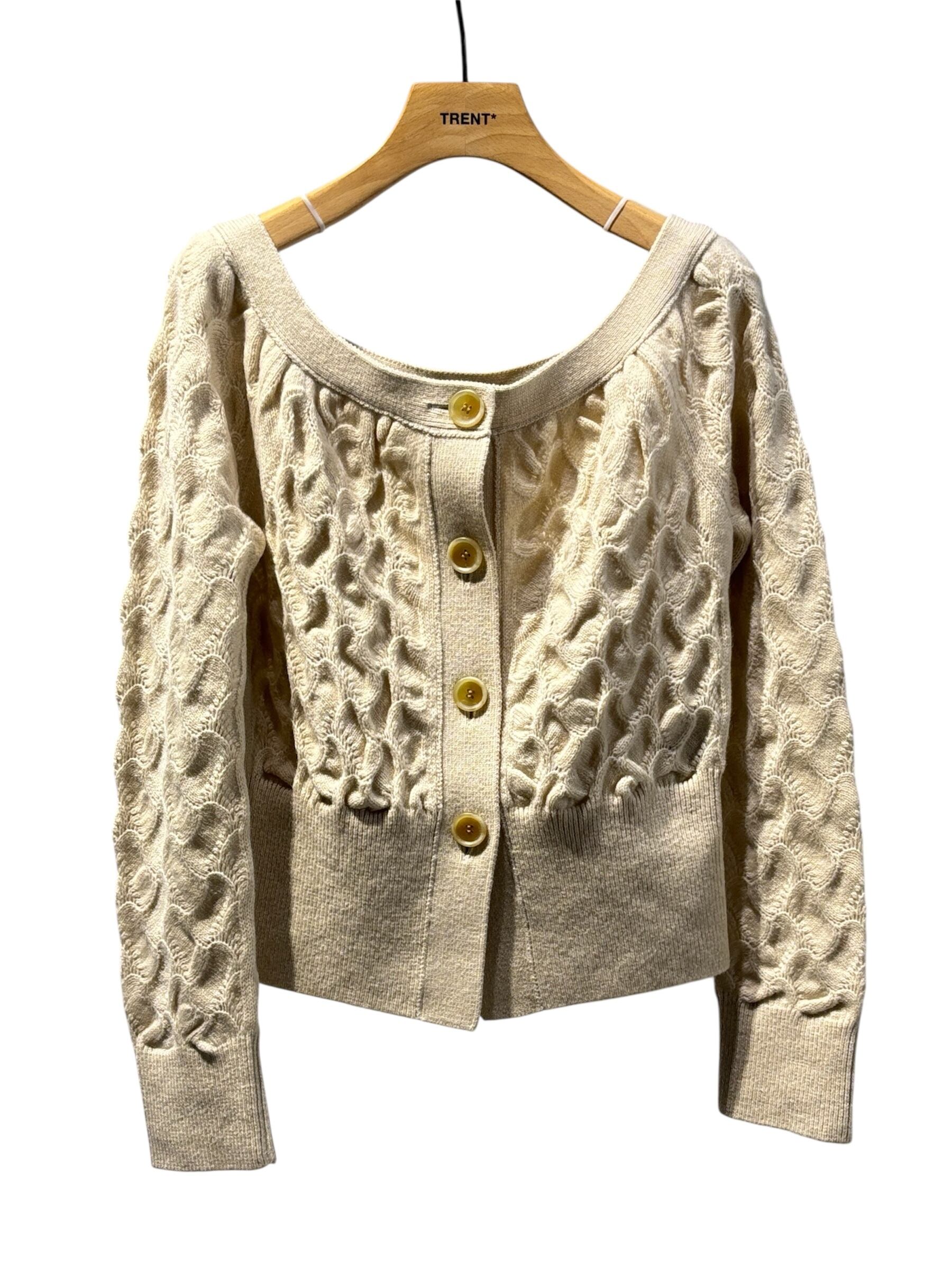 変形透かし柄のオフショルダーカーディガン。