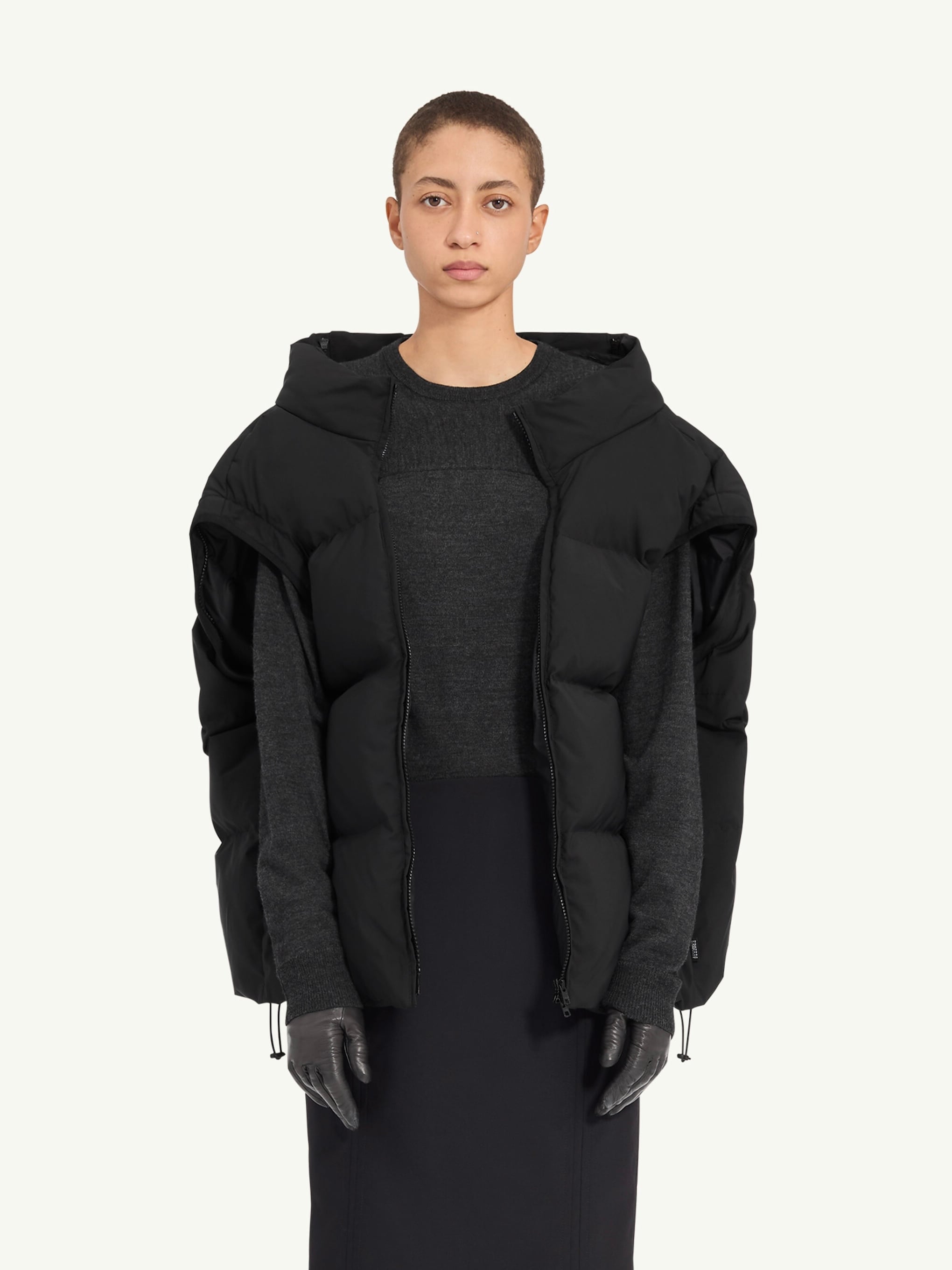 ジップで取り外し可能な袖により、立体的なジレとしても着用でき、