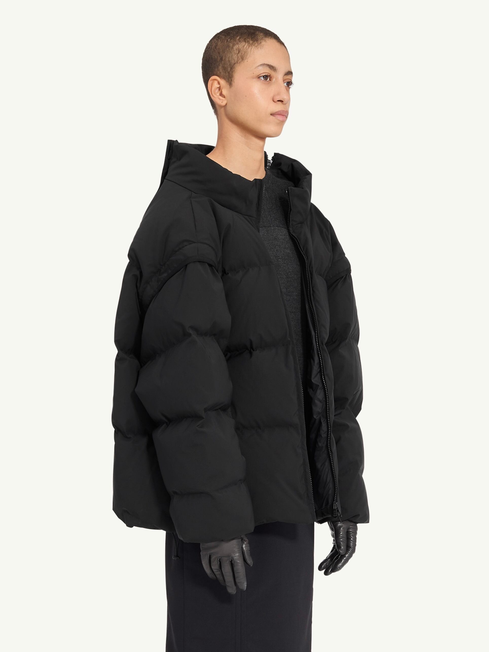 シルエットの変化が楽しめるデザインが特徴の中綿入りジャケット。