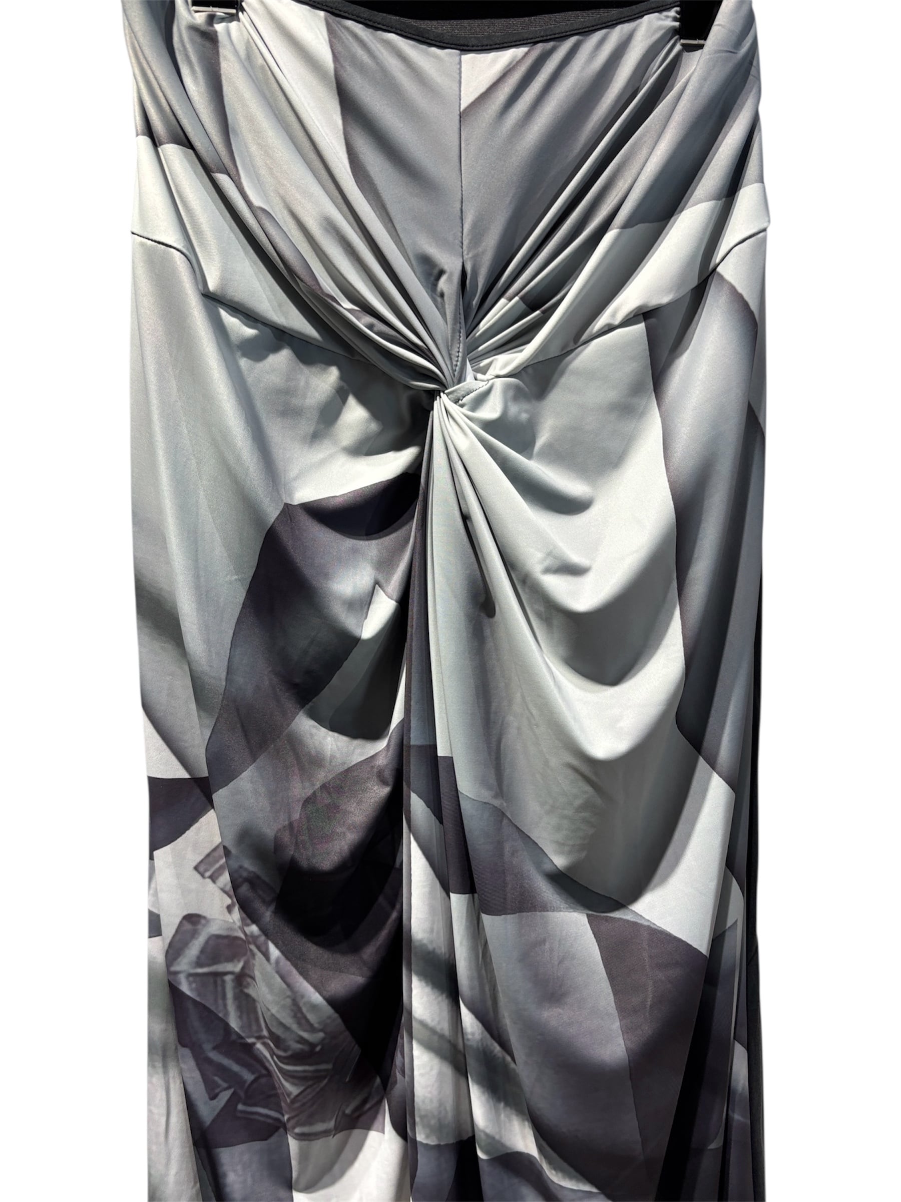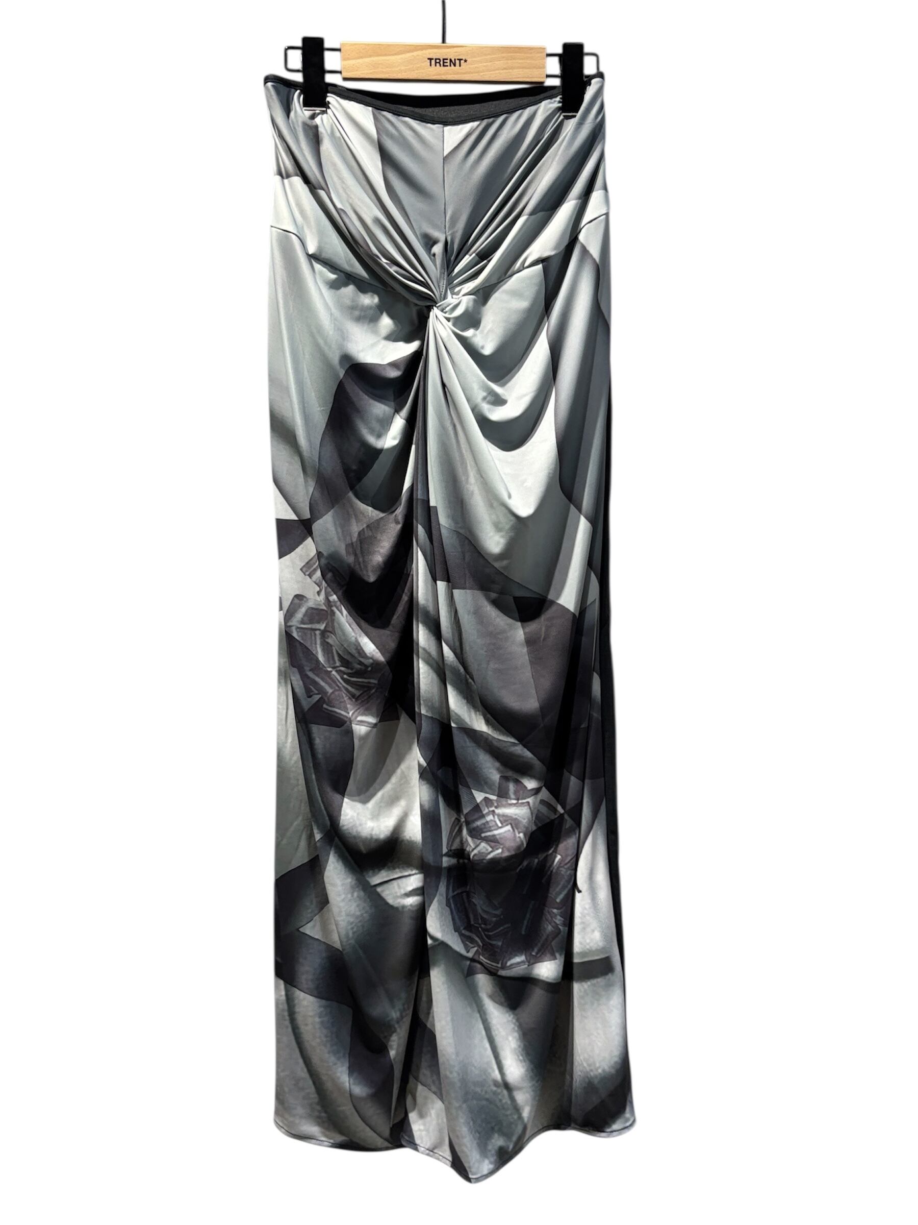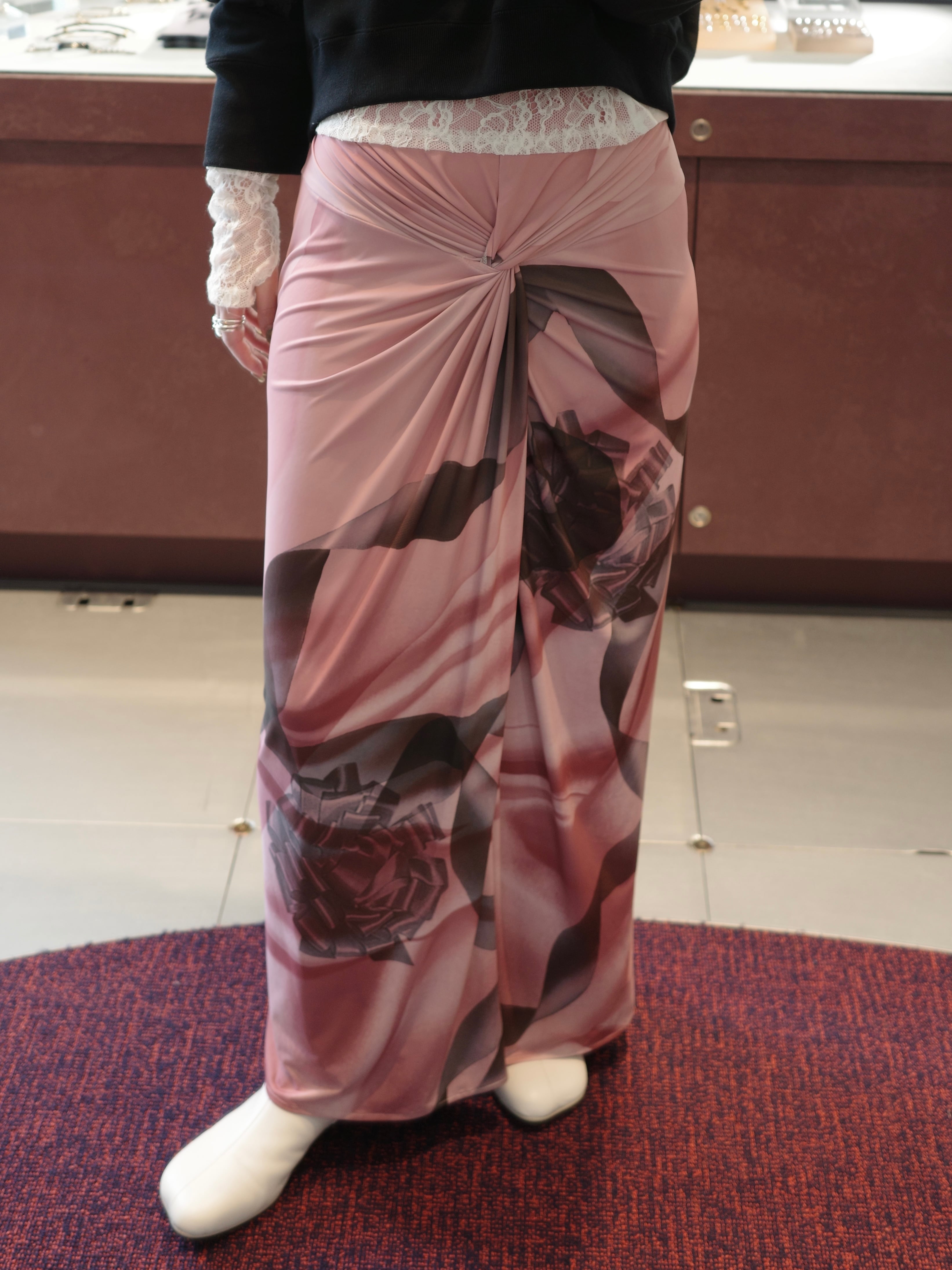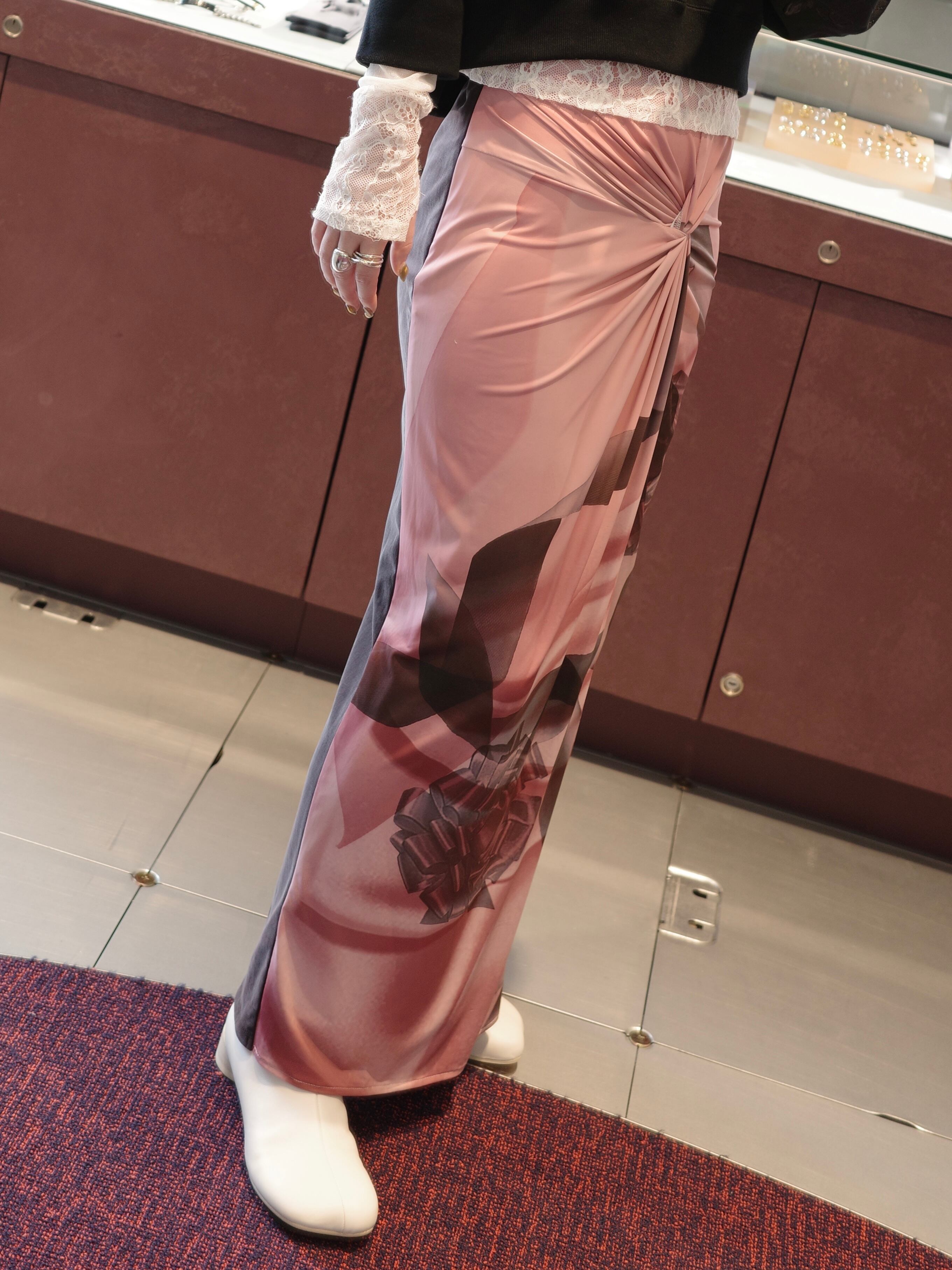 ラッピングリボンを巻き付けた様な大胆なプリントがキャッチーなスカート。