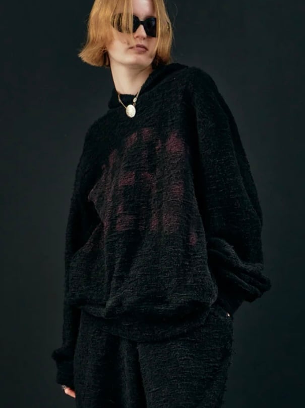 ブロークンファブリックに見せた裏毛生 地を使用したフーディー。