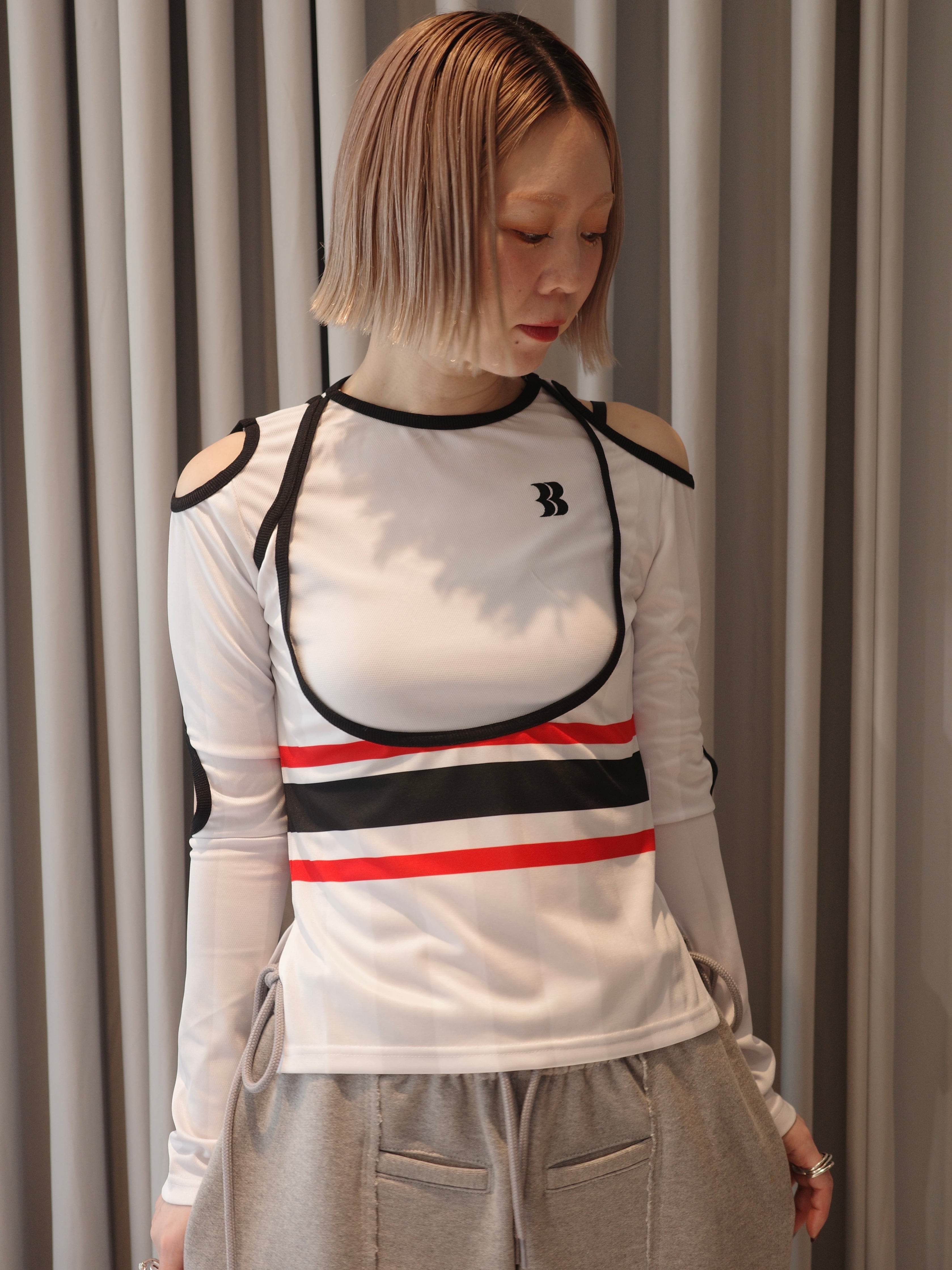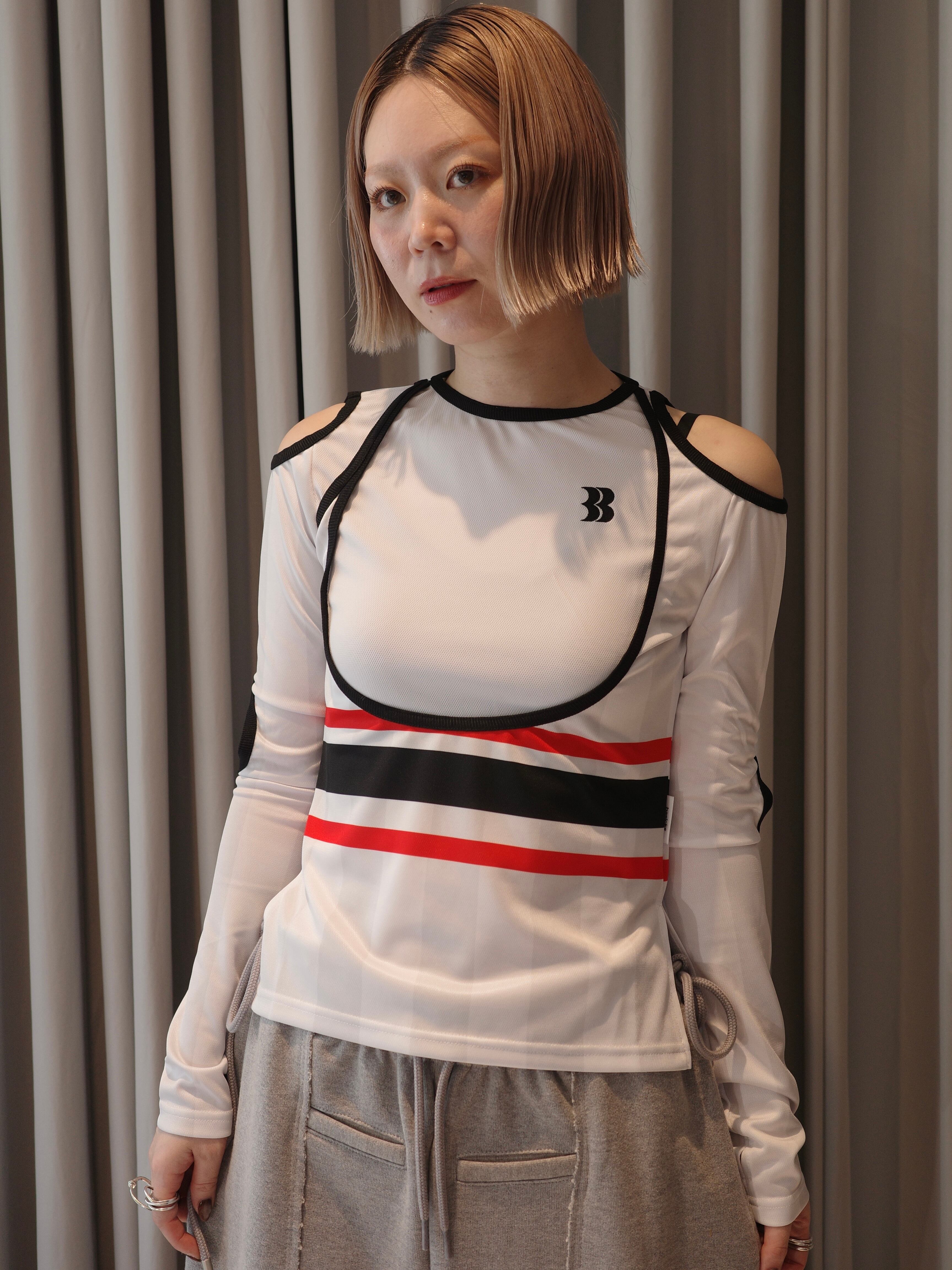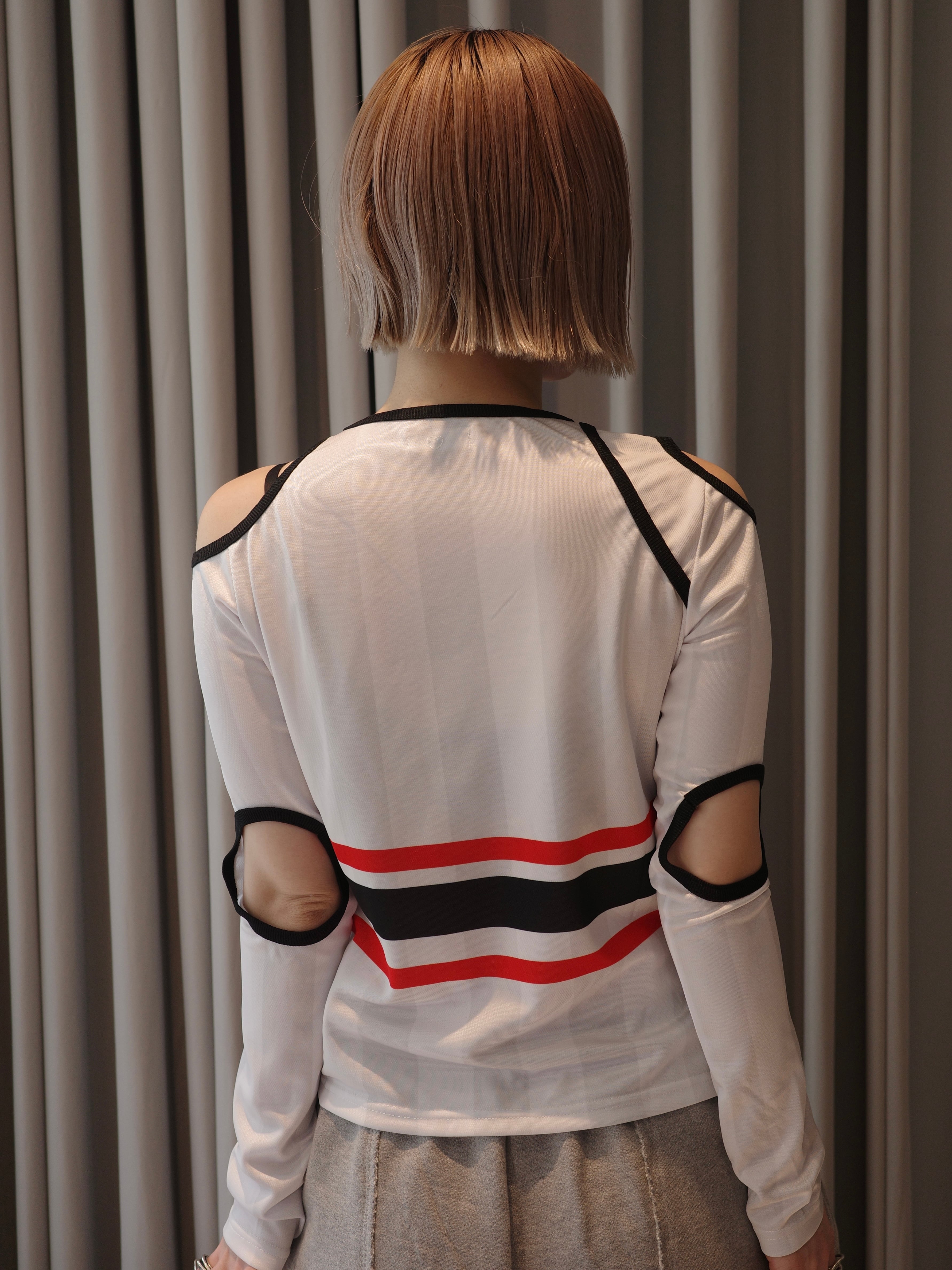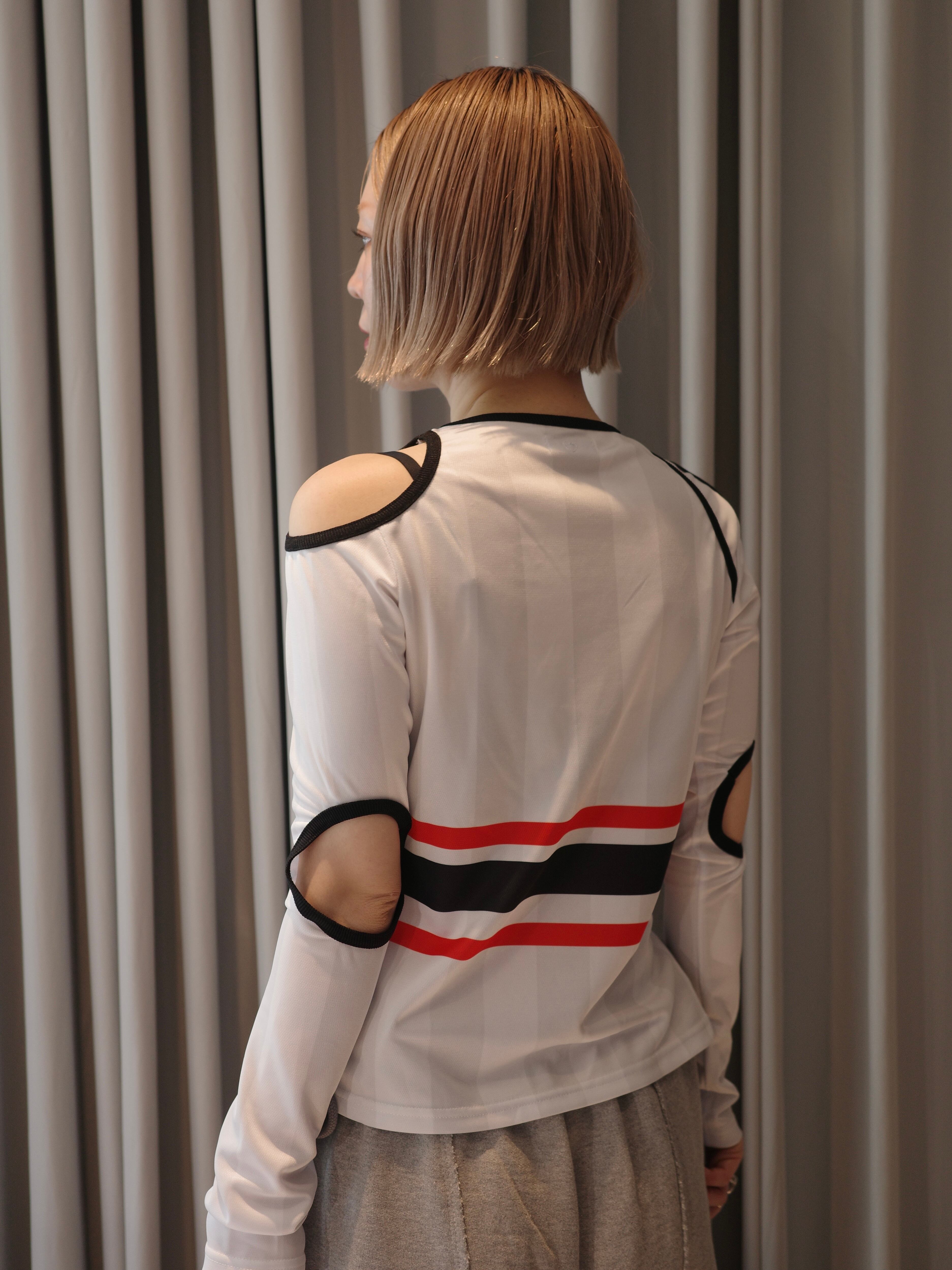 白のステッチワークを用いた縫製が特徴で、これにより服の「輪郭」を強調し、デザインを可視化しています。