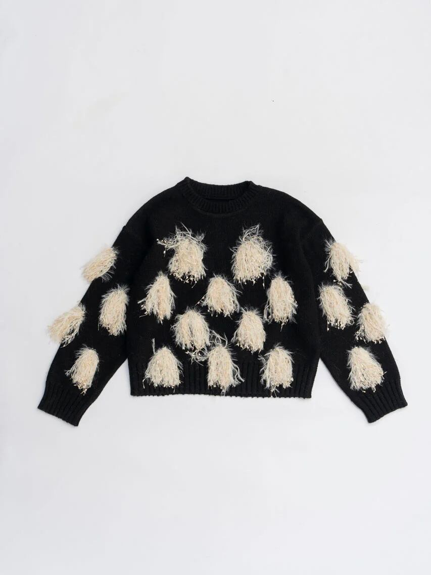 張り感のある身頃の素材に対し、ボンボンの部分には光沢のあるフラッグヤーンとシャギーヤーンをミックスさせ、より立体感を演出。