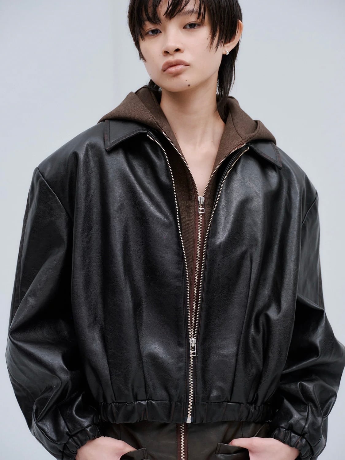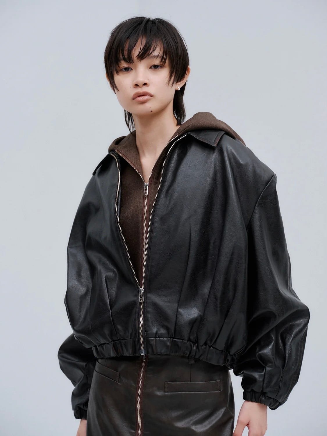 フードのレイヤードスタイルが楽しめる合成皮革ジャケット。