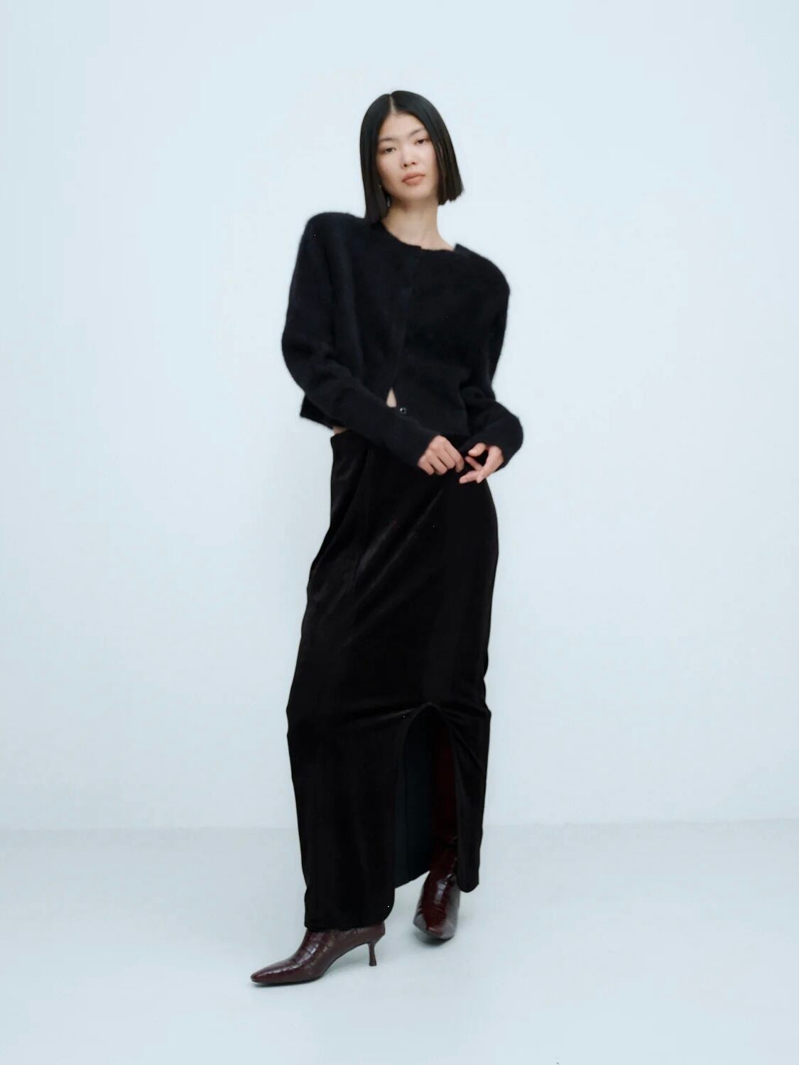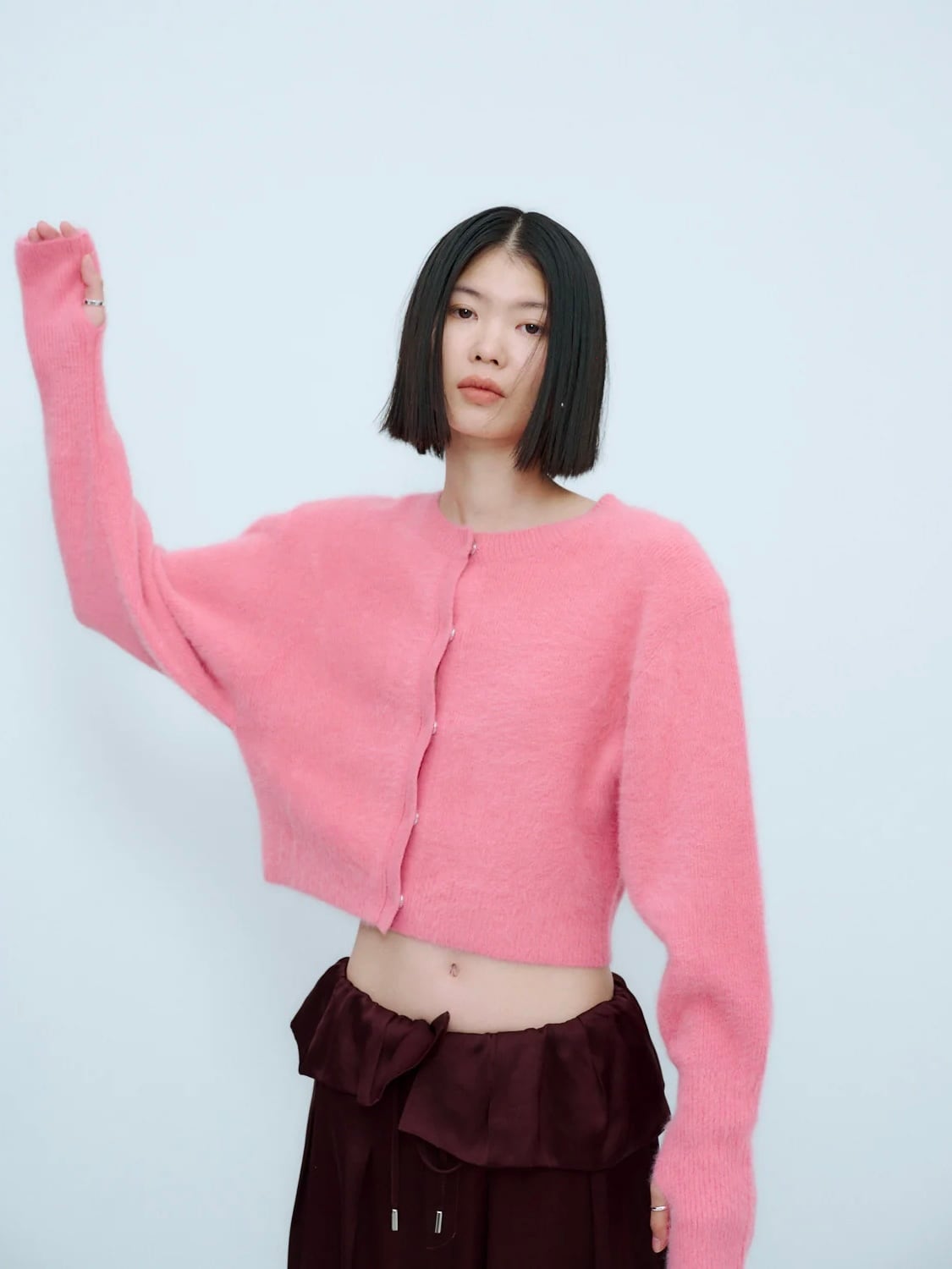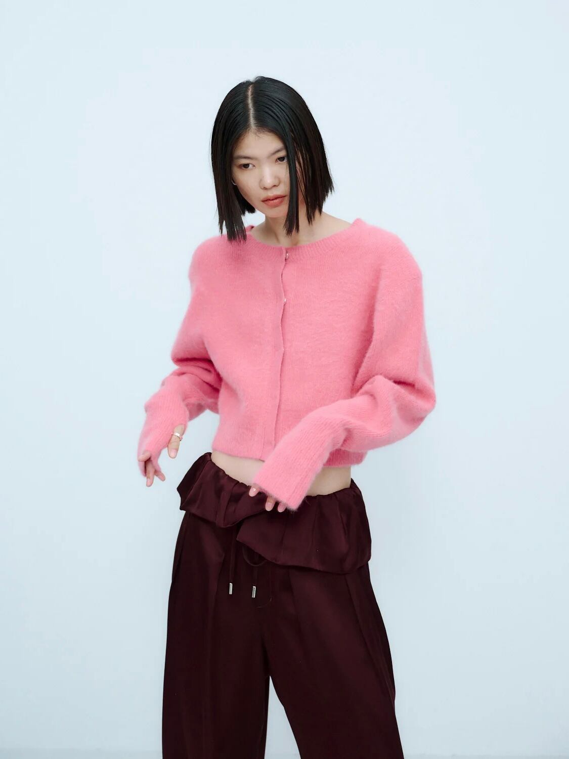 フォックスカシミヤ糸を贅沢に編み立てたカーディガン。