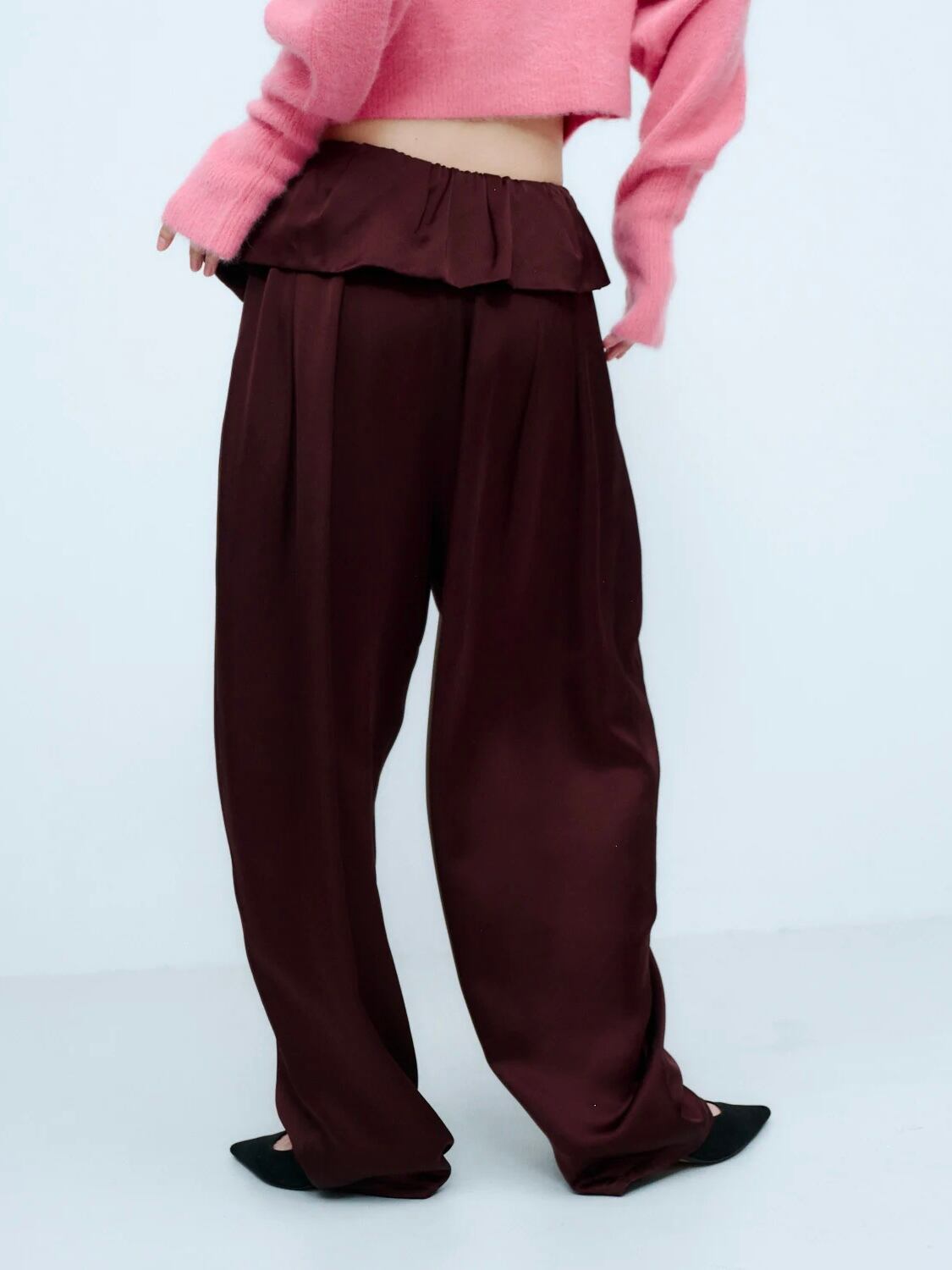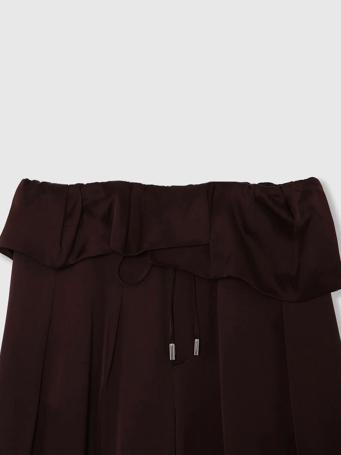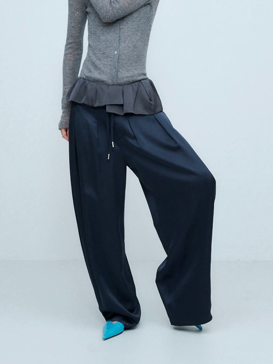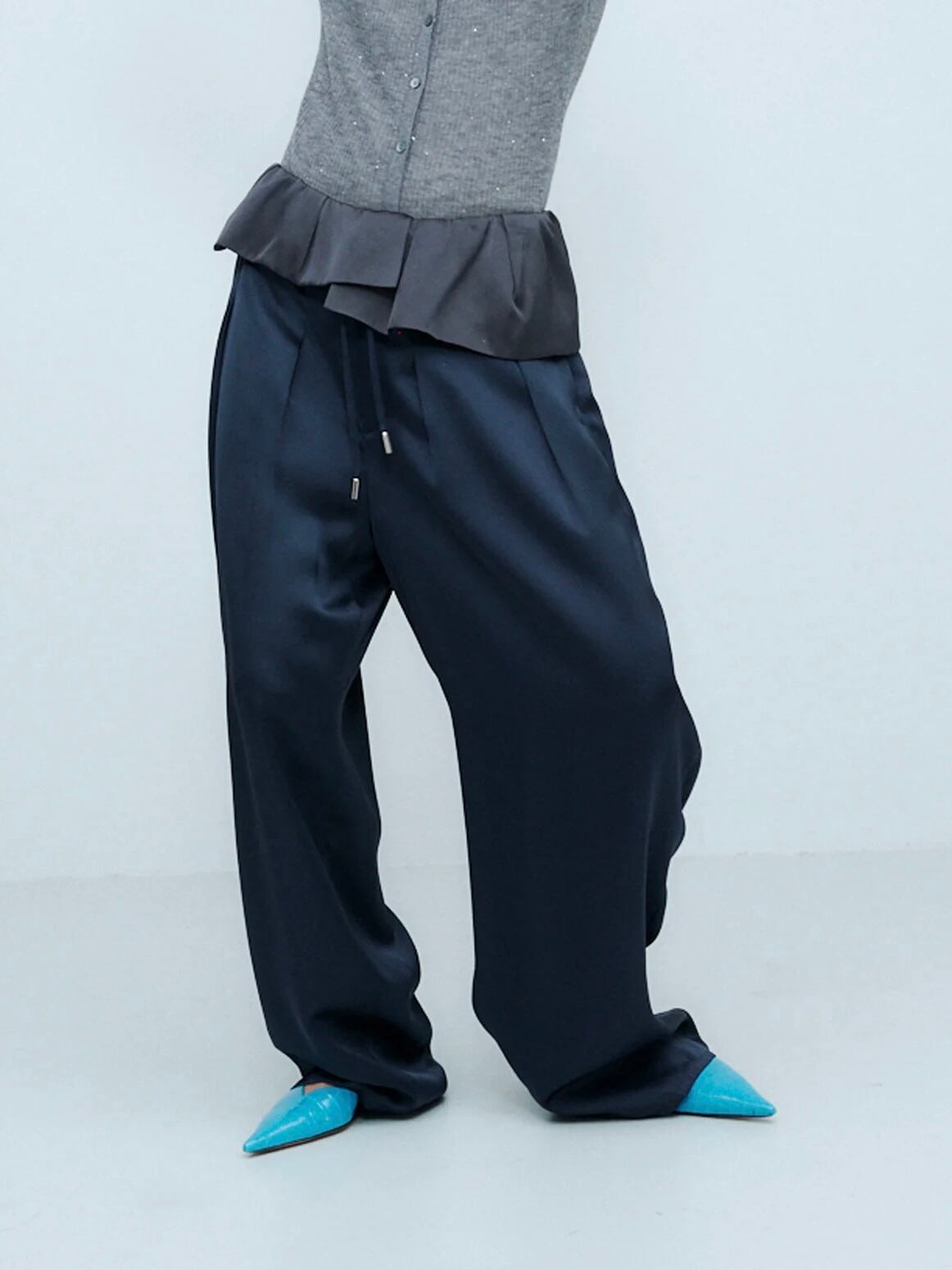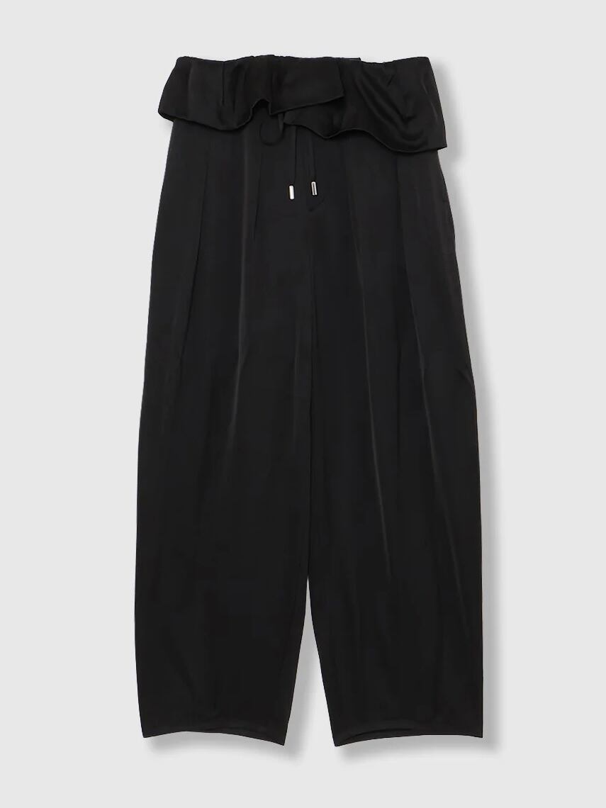 アシンメトリーなペプラムが印象的な、サテン素材のイージーパンツ。