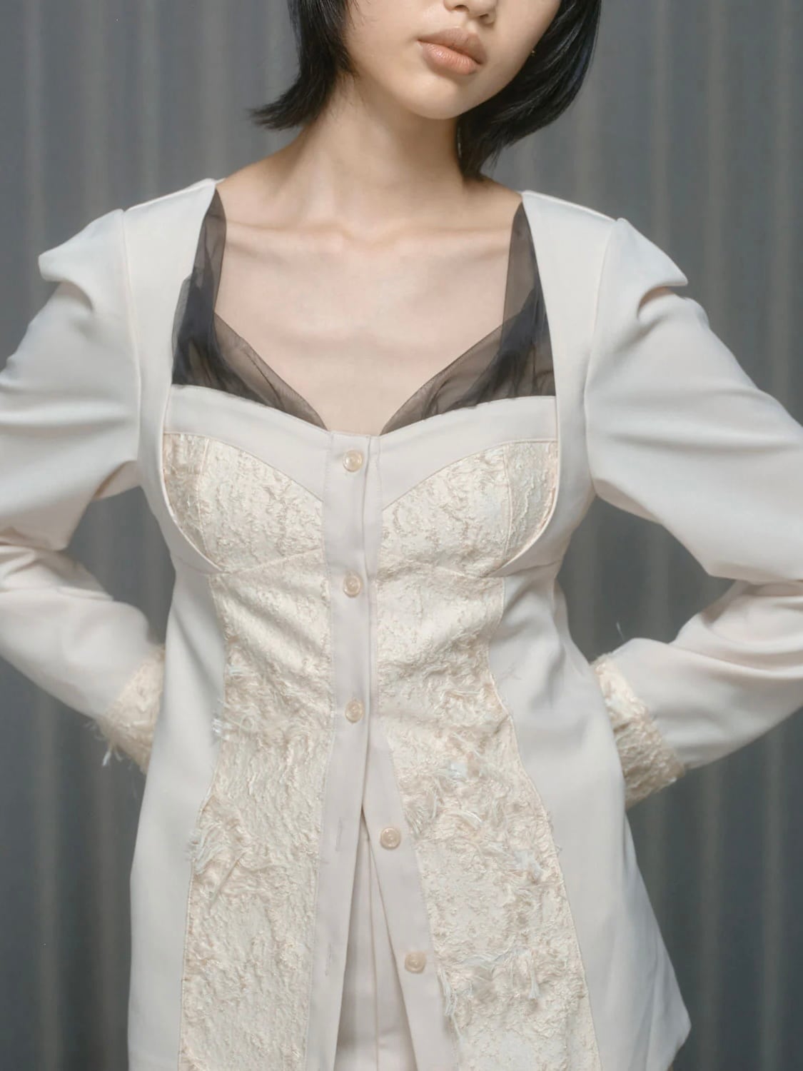 ビスチェディテールと異素材使いが印象的なアイコニックシャツ。