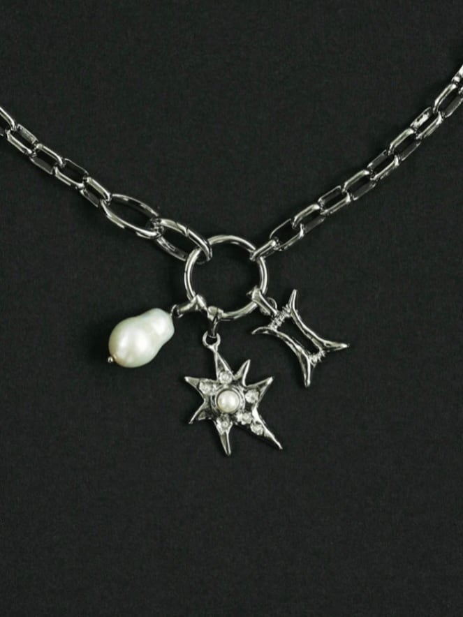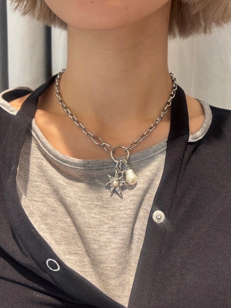 静かな存在感を放つチェーンに、淡水パールと “the sun” のトップを合わせて。星座チャームを選び日々のエネルギーを整えるお守りのように。
