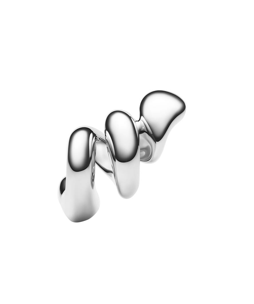 耳に沿って渦を描くように立ち上がるコイルは、まるで3連のボリュームフープを重ねたような錯覚を生み出し、未来的でエレガントな存在感を放ちます。長さ約2.4cm。