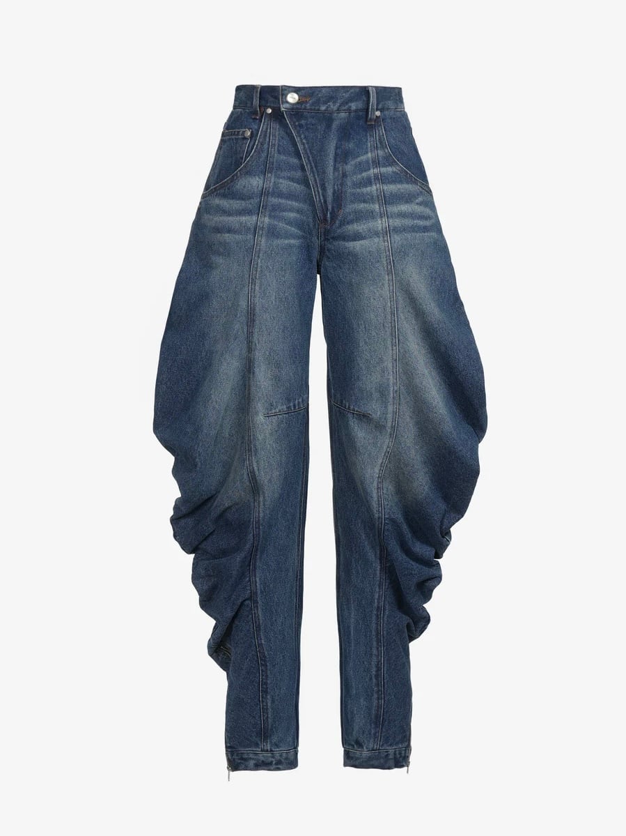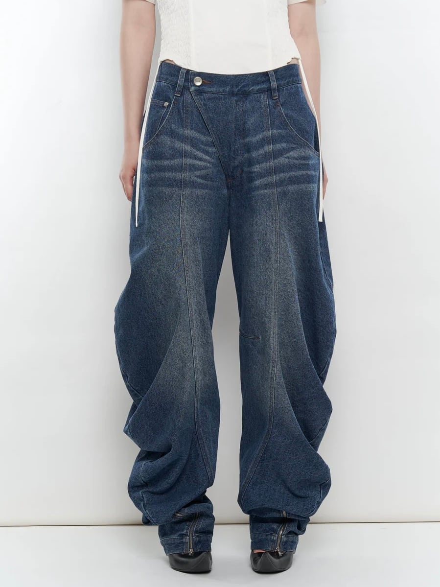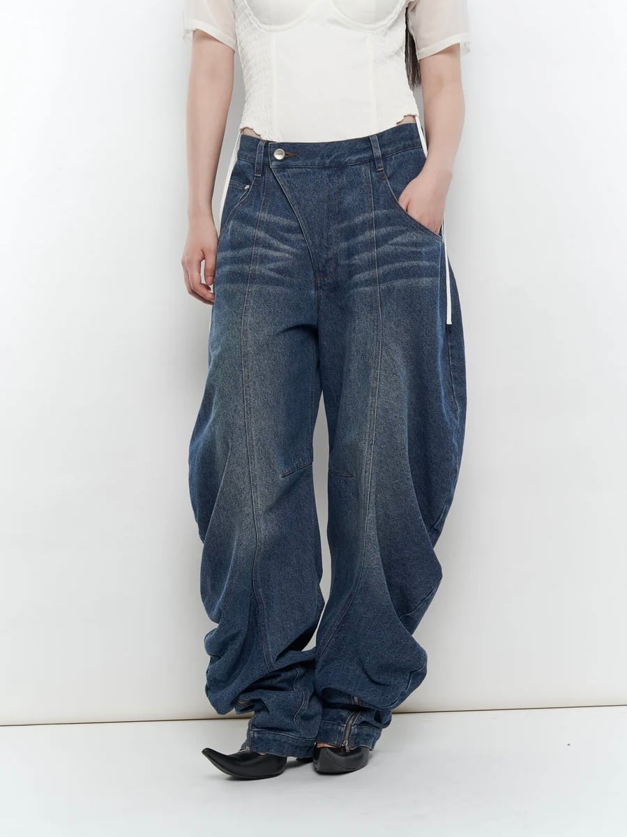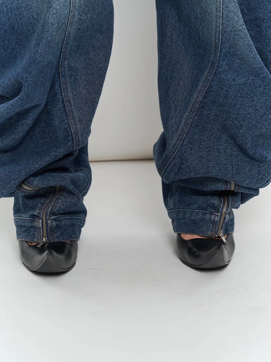 ・裾に向かって溶け落ちているようなデザインのデニムパンツ。