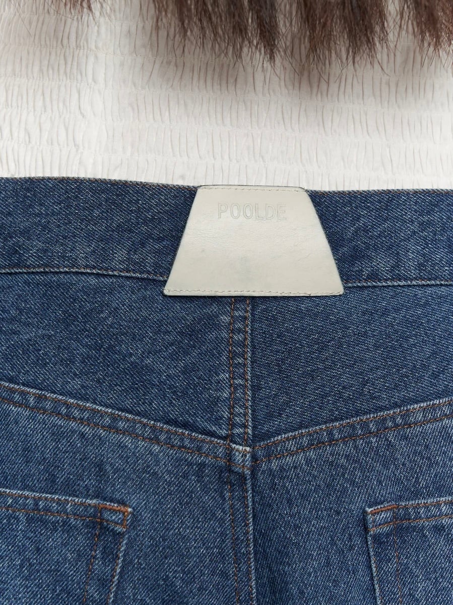 ・後ろのベルト中心についたPOOLDEの白い革パッチと、