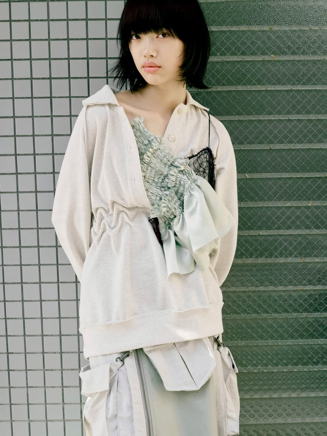 「日々の生活に輝きを創造する」をコンセプトに、デザイナーの安藤が得意とするスモッキング刺繍を駆使したアイテムを提案。生地の裏側から布をつまに合わせ、立体的に絵を浮き立たせる手刺繍によって、繊細ながら力強い、気品溢れる女性像を表現している。
