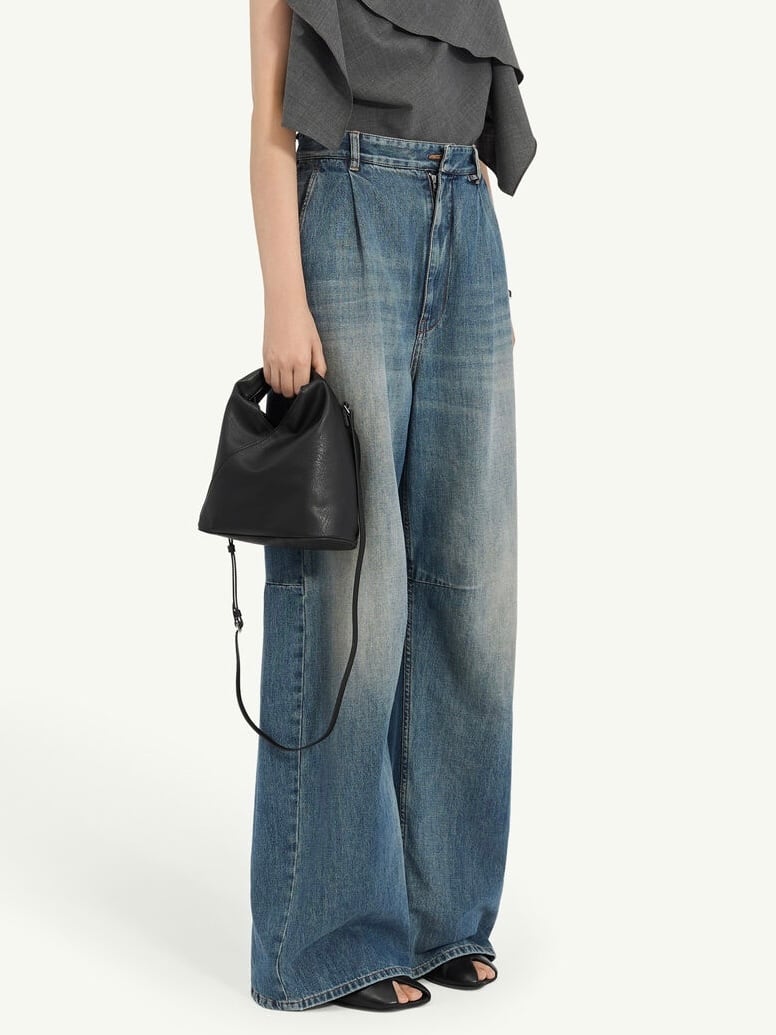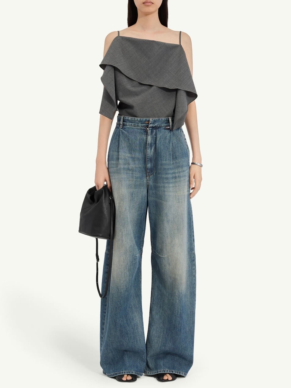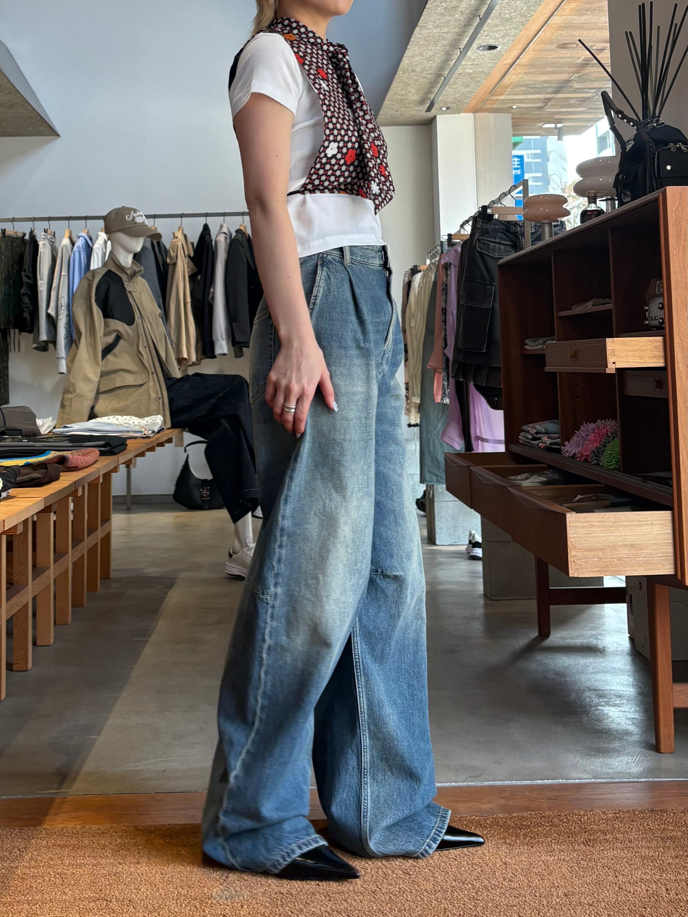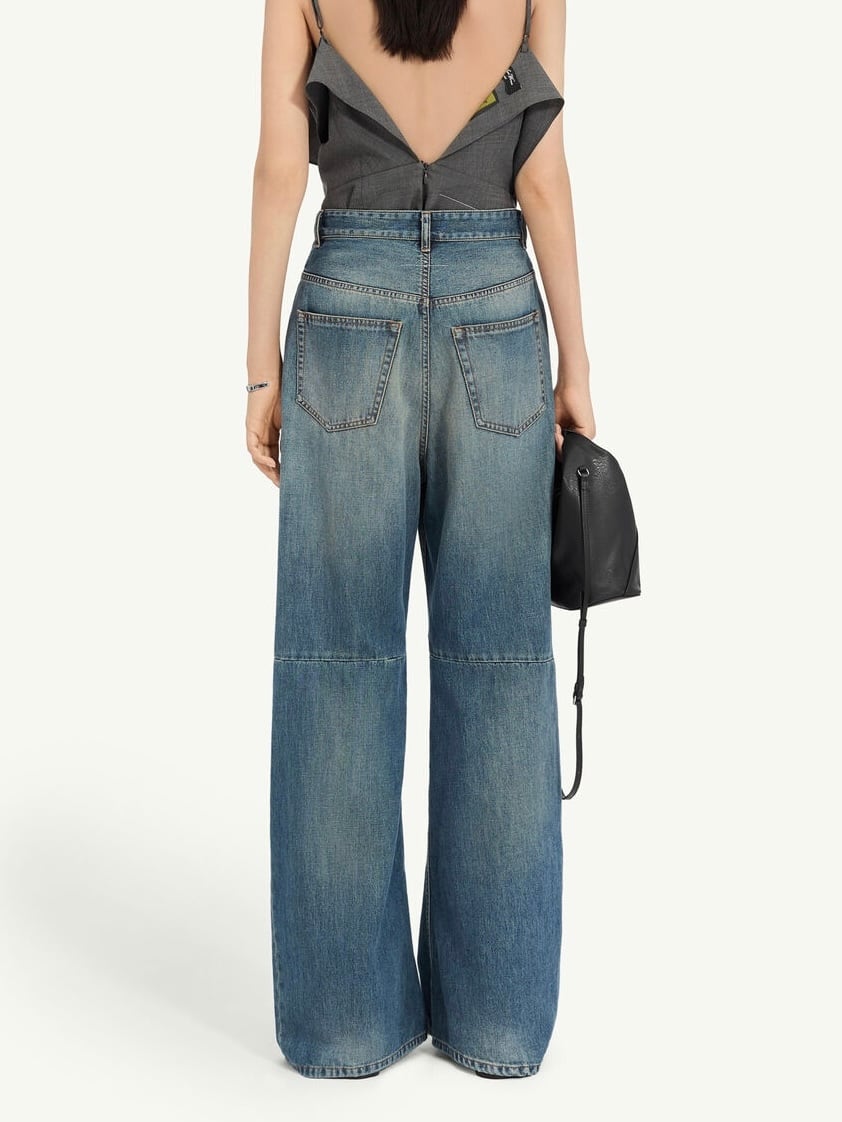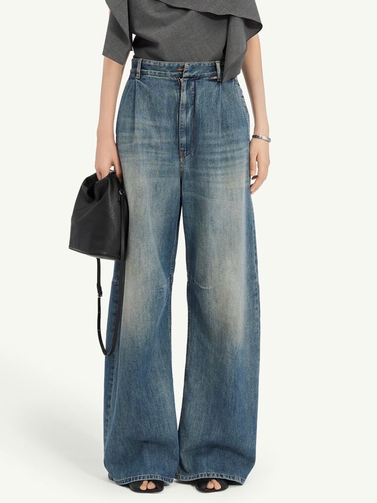 ウォッシュ加工を施したコットンデニムを使用したワイドレッグジーンズ。