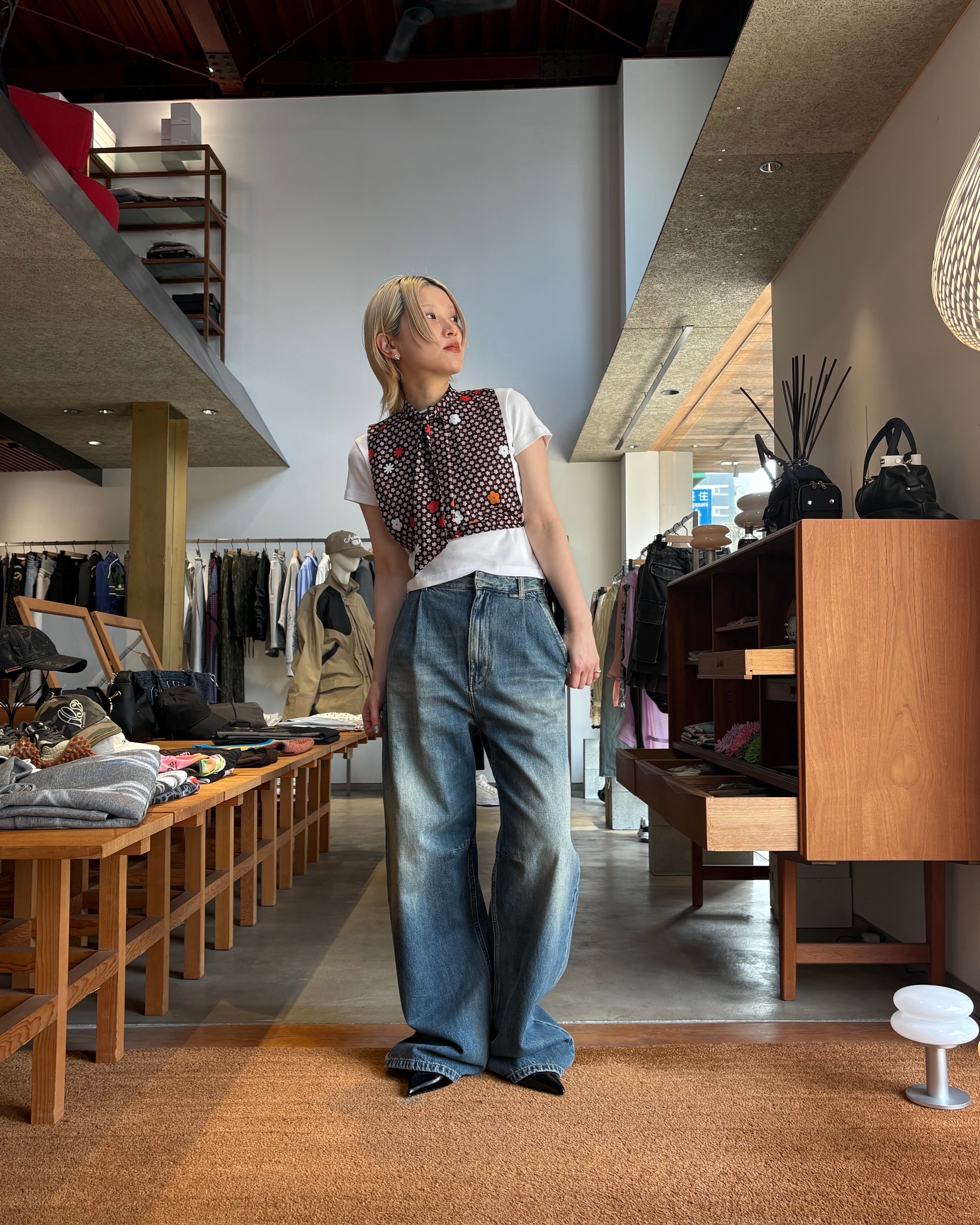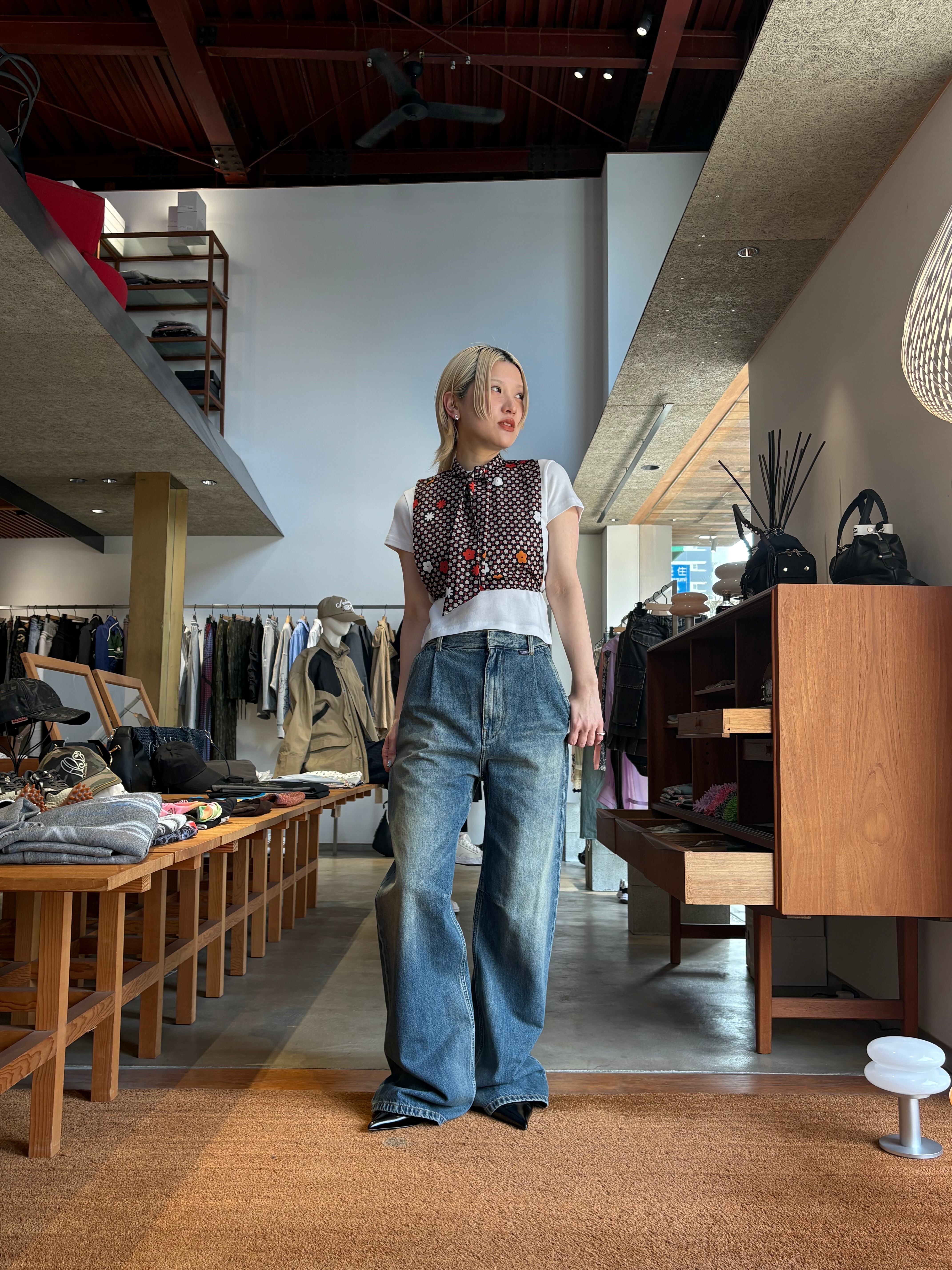 色落ち加工とタバコ色の糸を使ったステッチが質感とディテールを加えています。