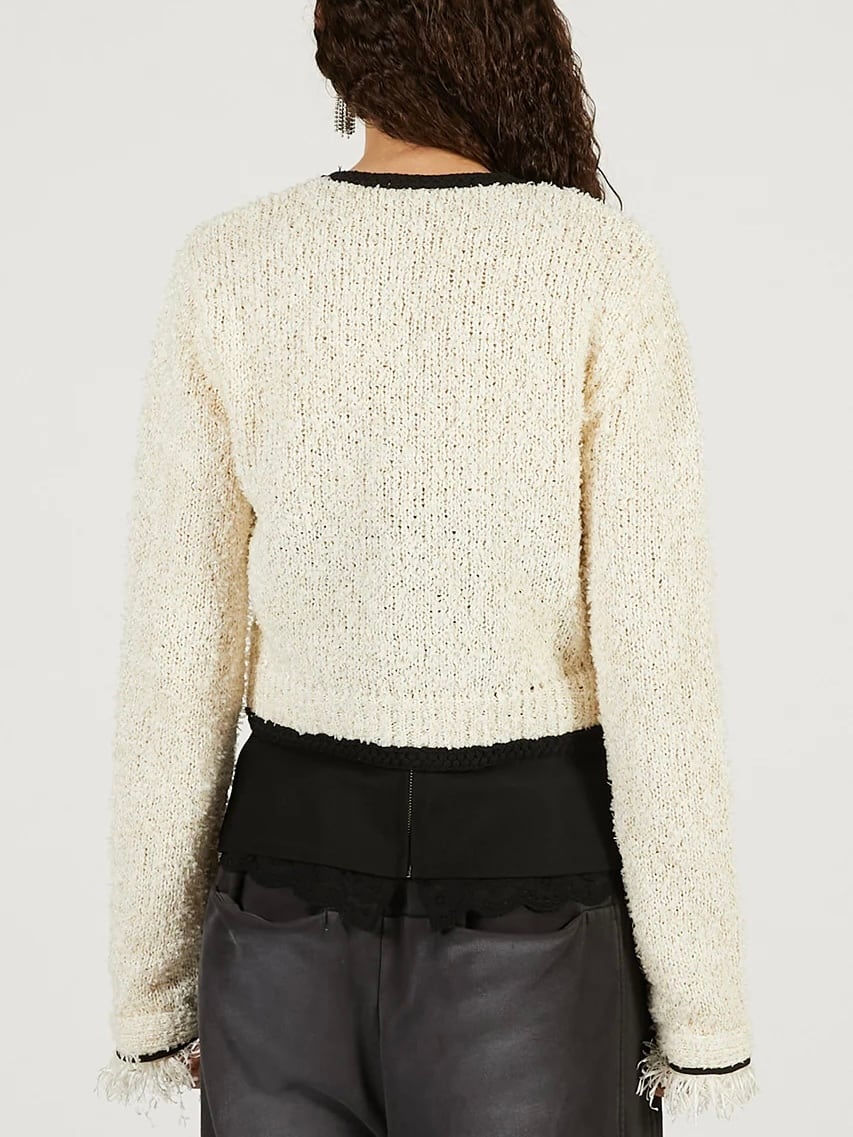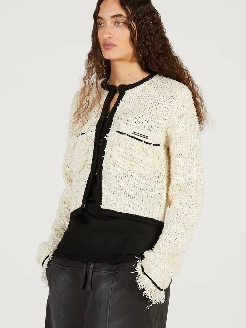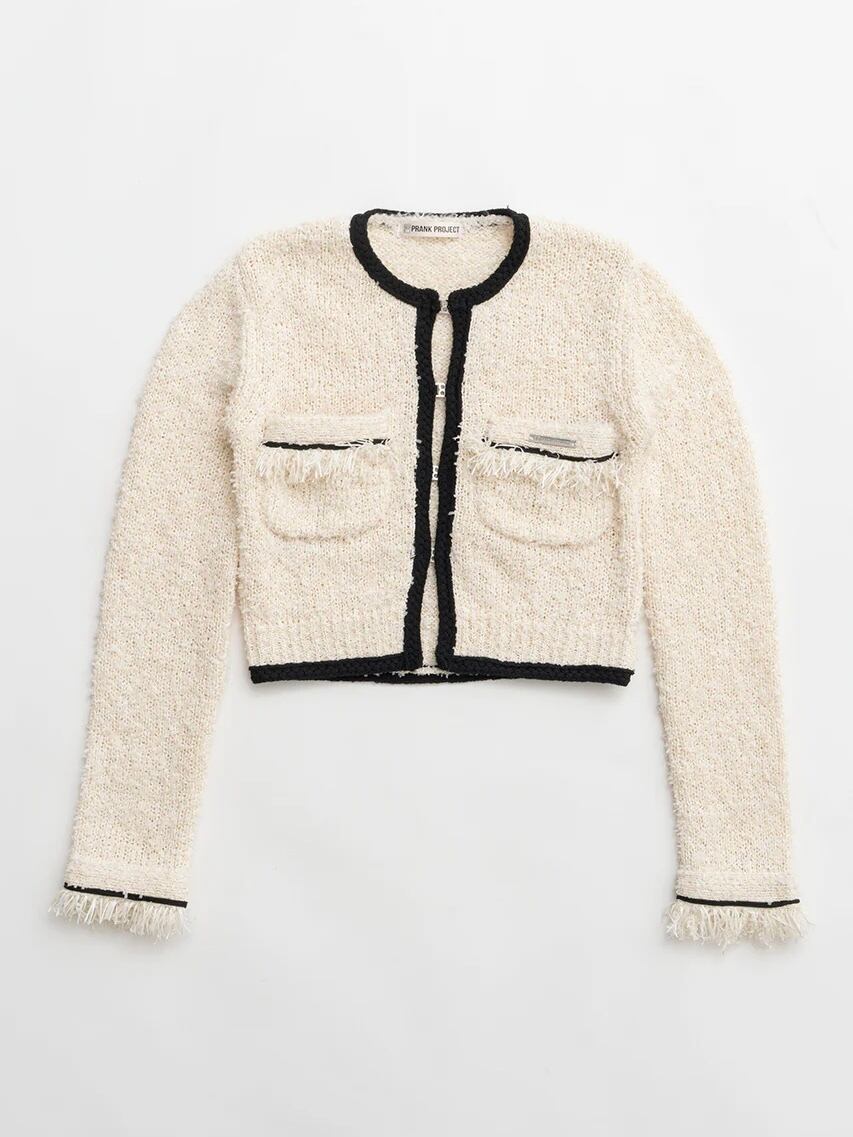 メタルチャームをフロントに施したコンパクトなサイズ感のニットジャケット。