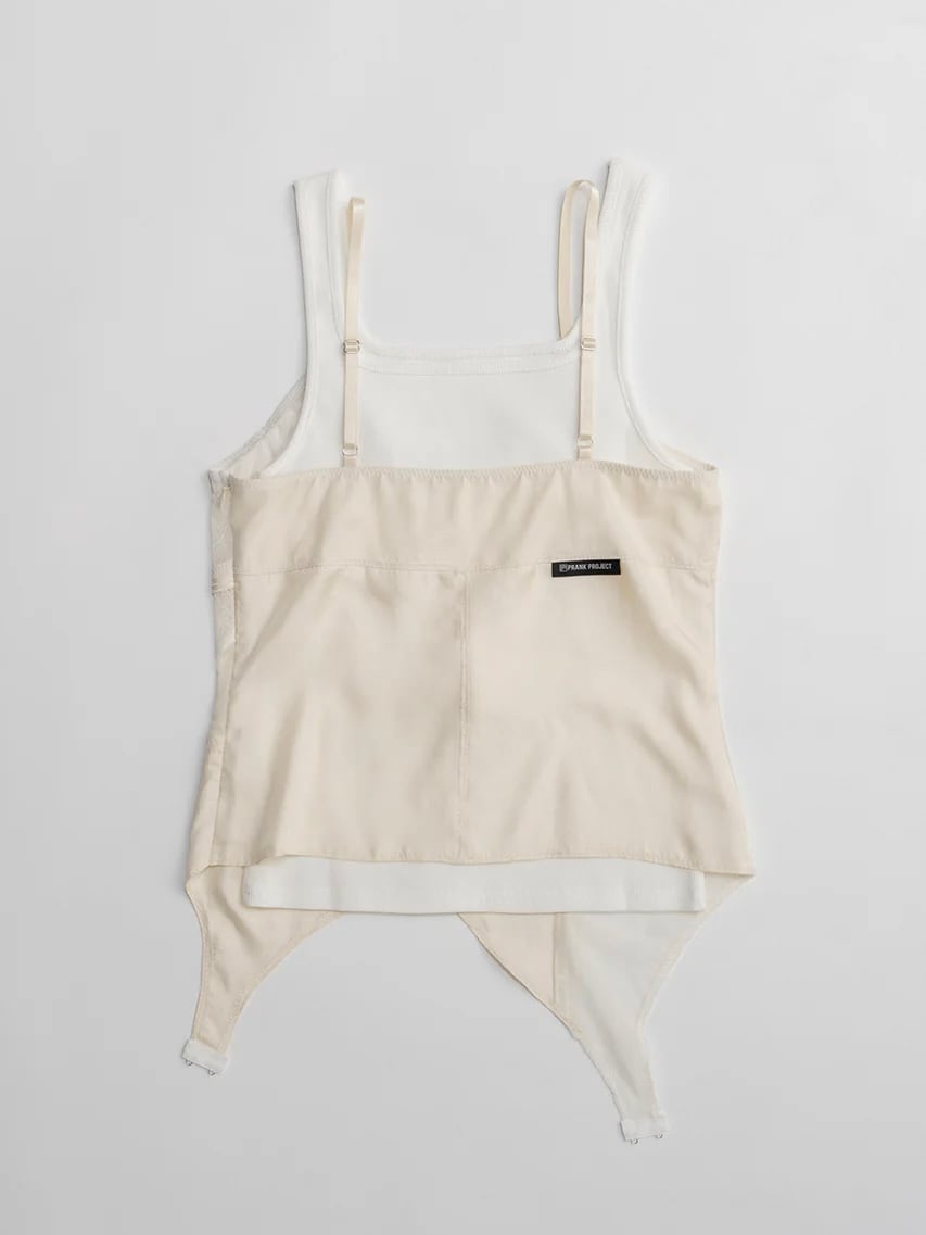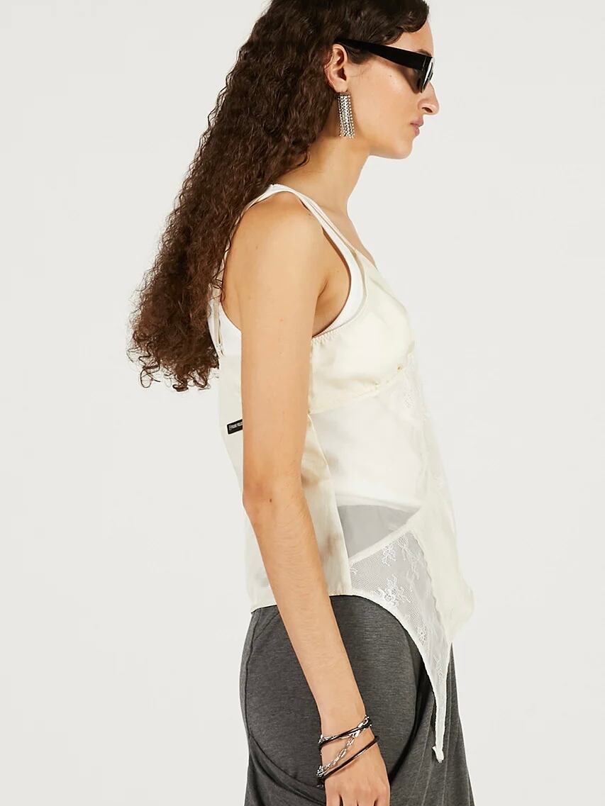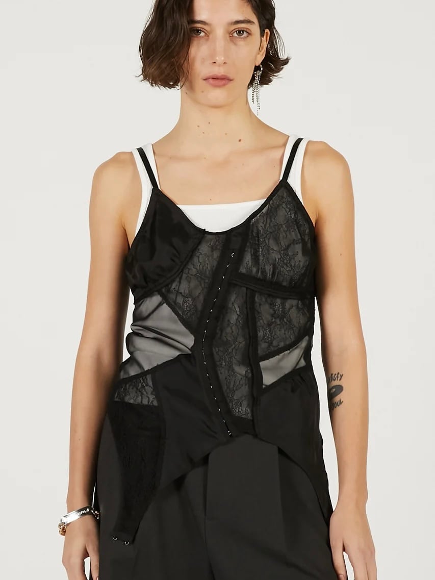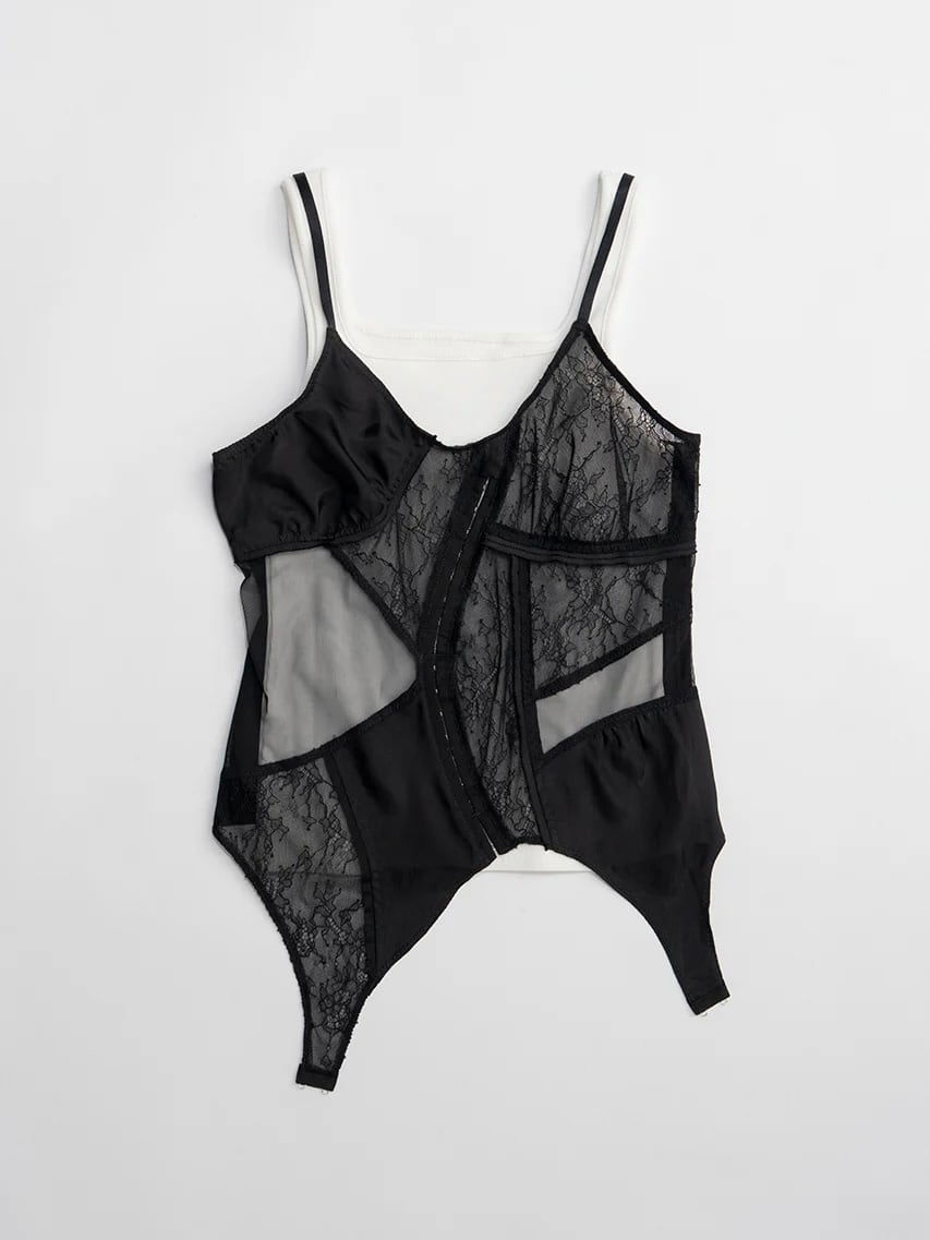ランジェリーを解体して接ぎ合わせたようなデザインのキャミソール。