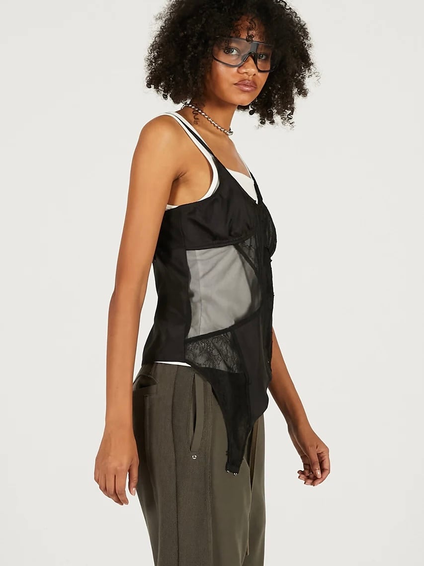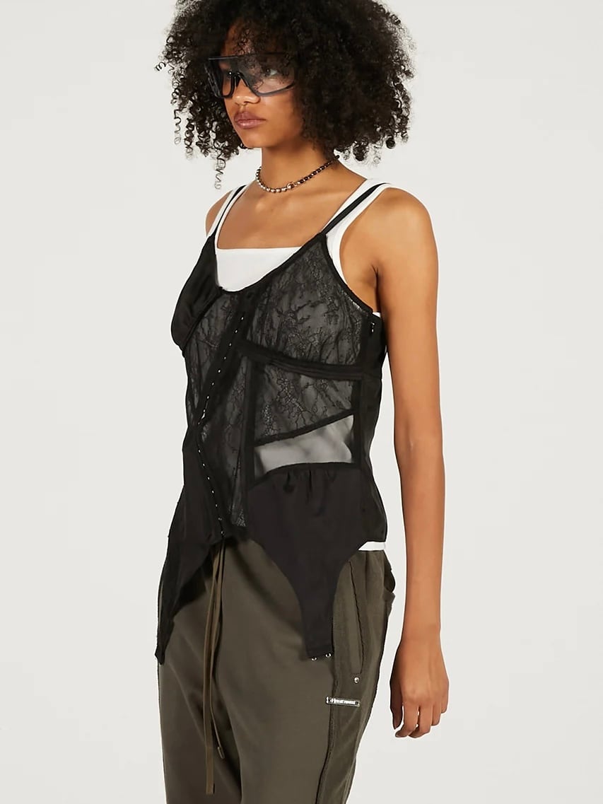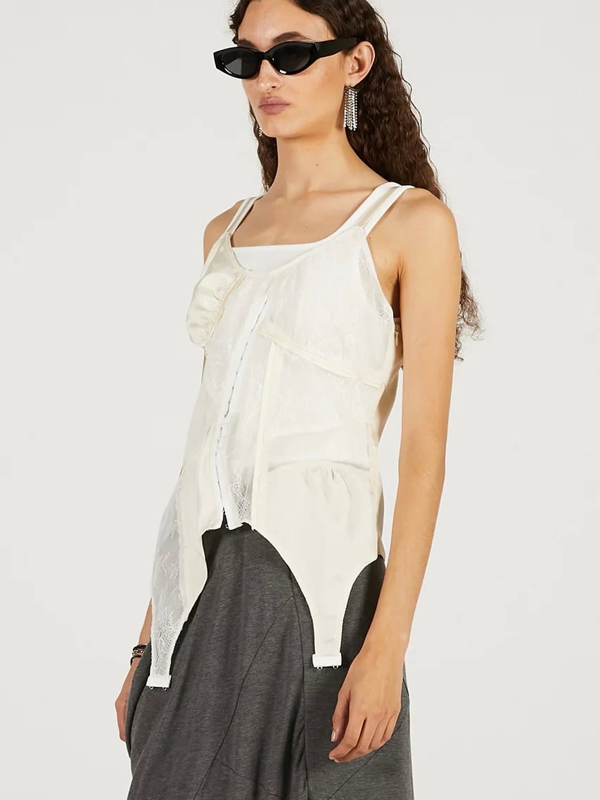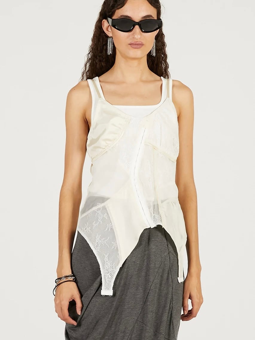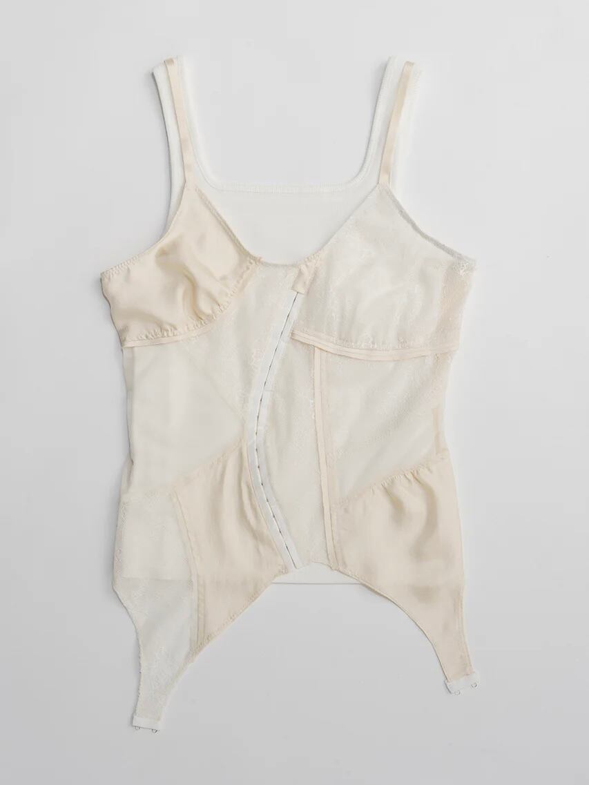 ランジェリーを解体して接ぎ合わせたようなデザインのキャミソール。