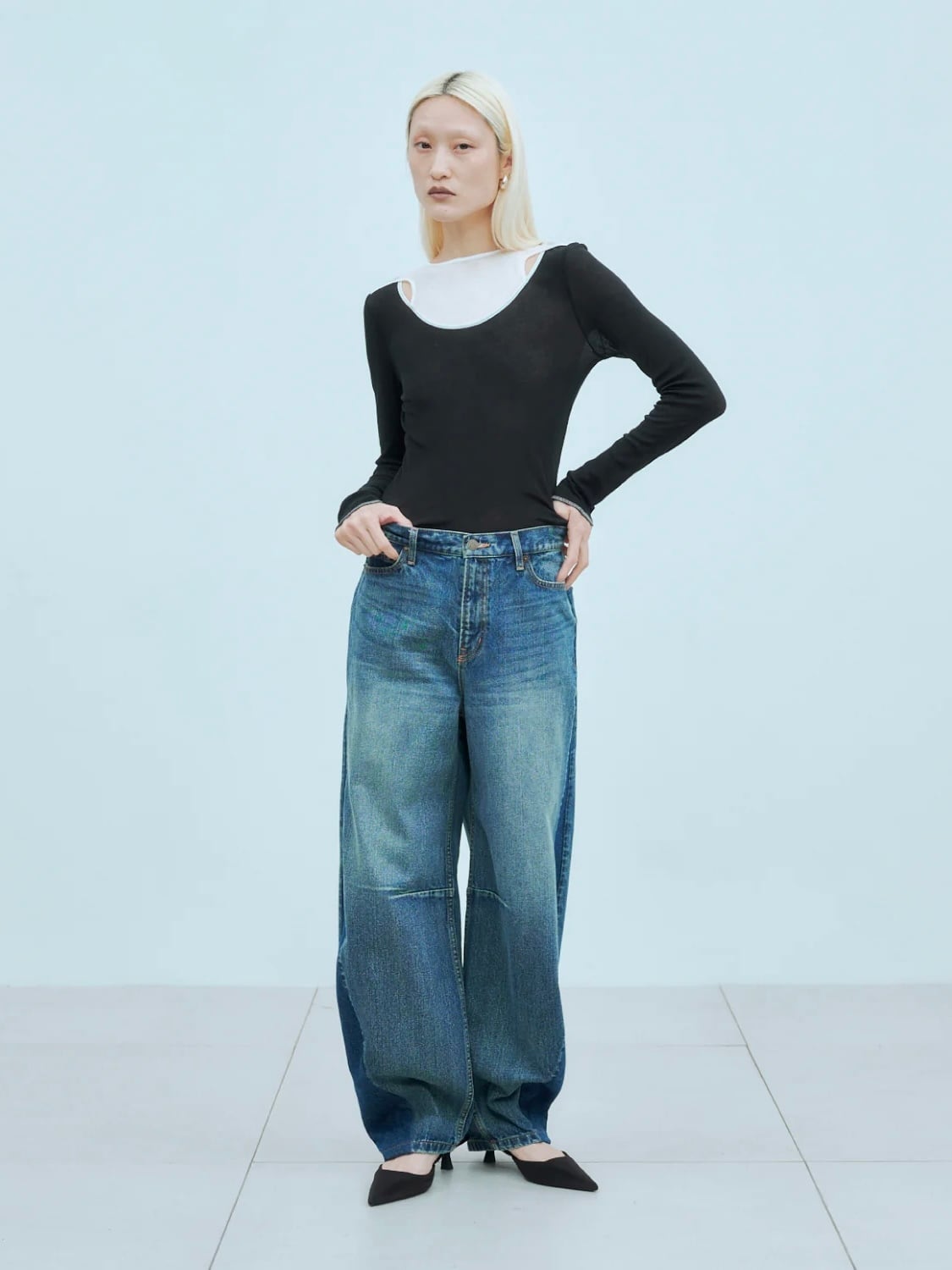 ボリュームのあるボトムと合わせたスタイリングがオススメ。