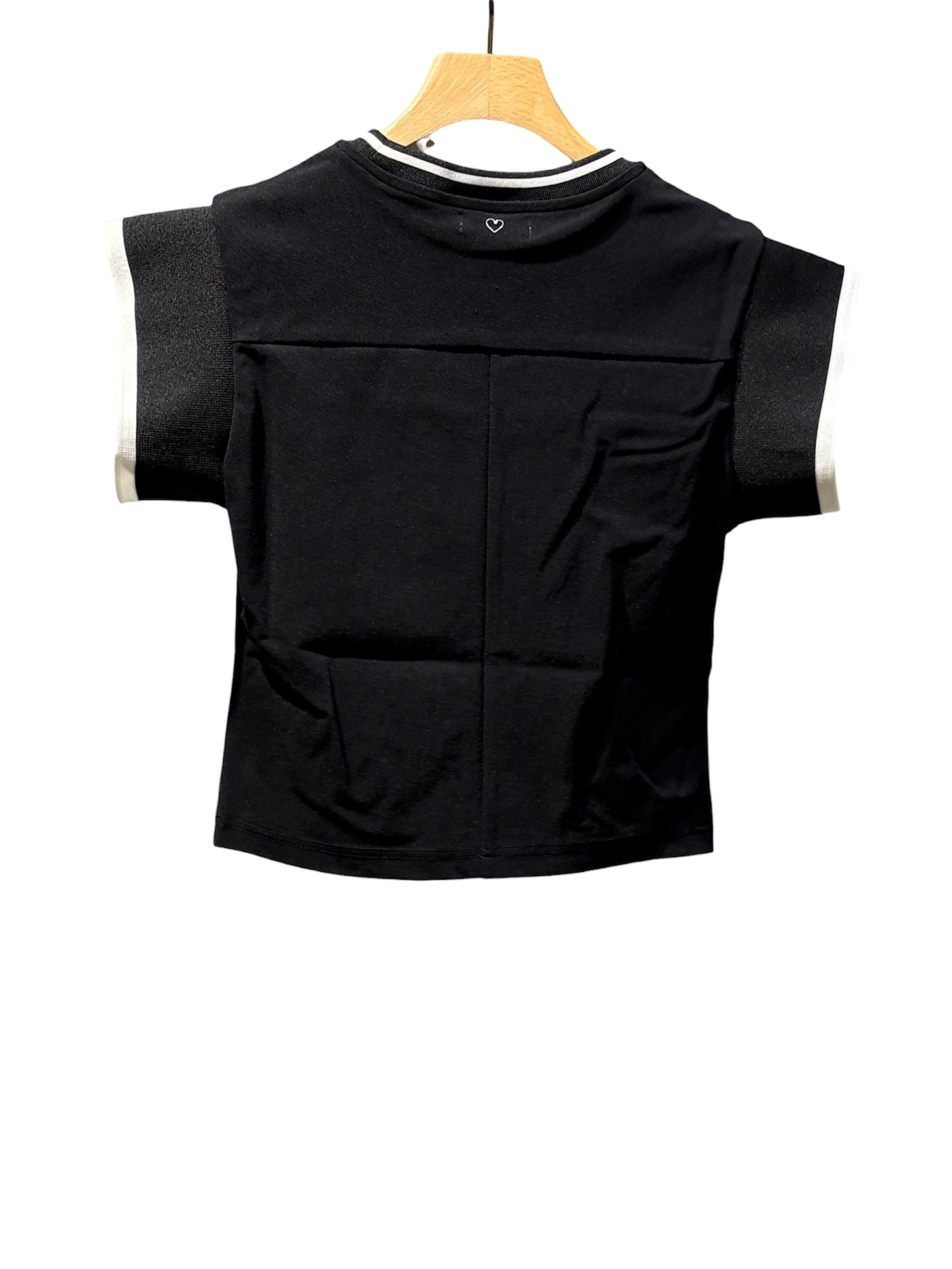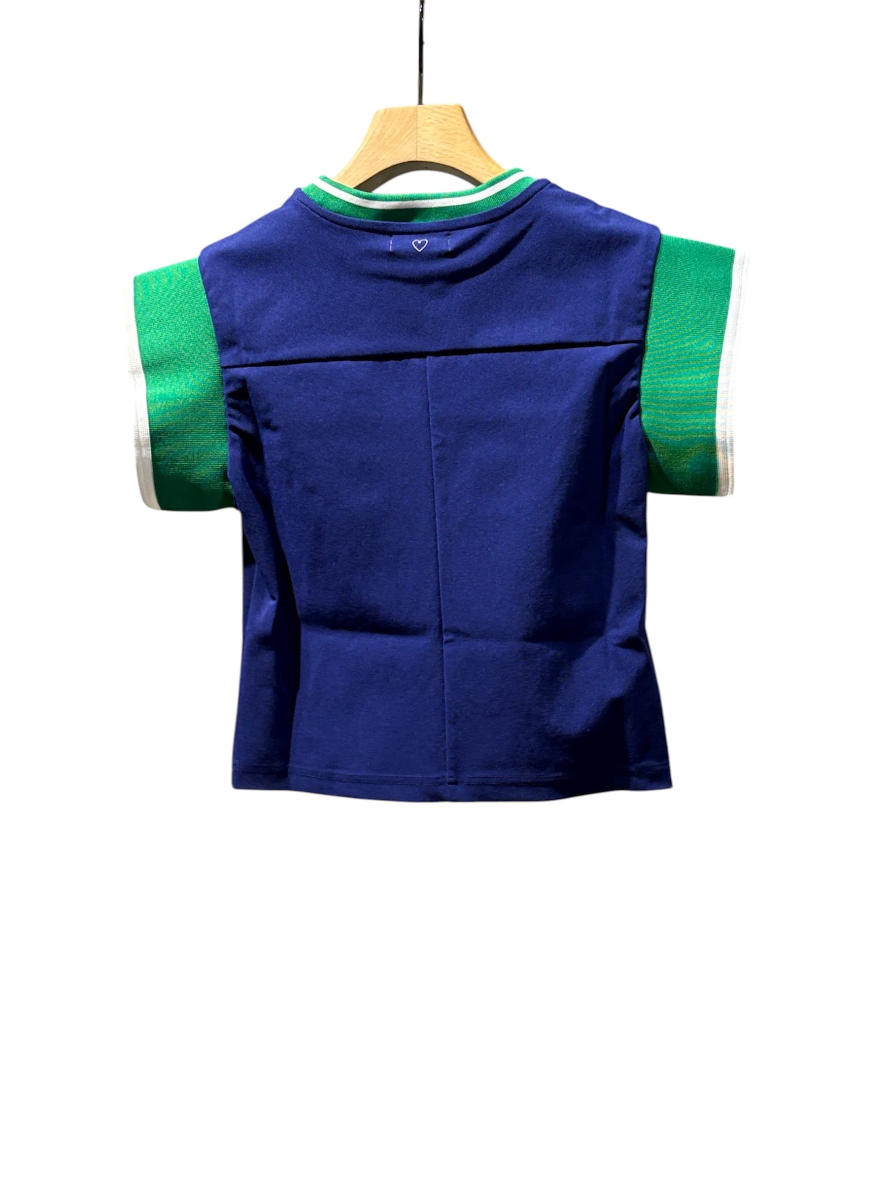 白のステッチワークを用いた縫製が特徴で、これにより服の「輪郭」を強調し、デザインを可視化しています。