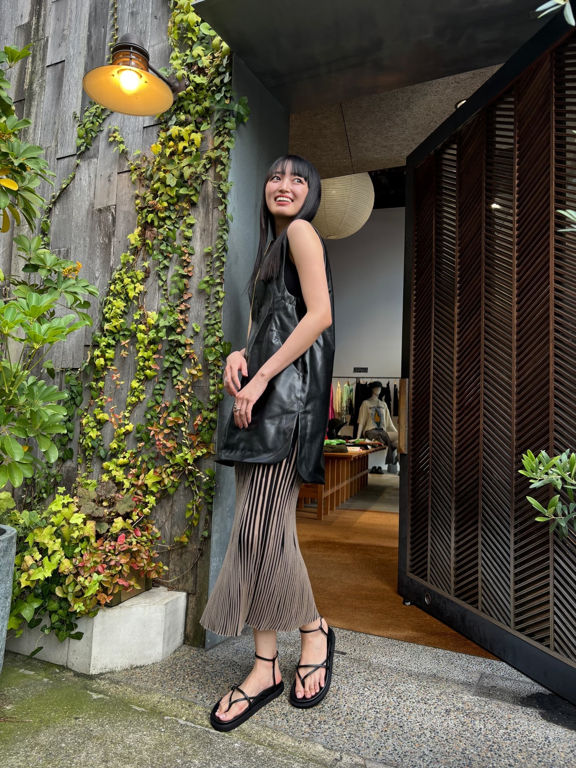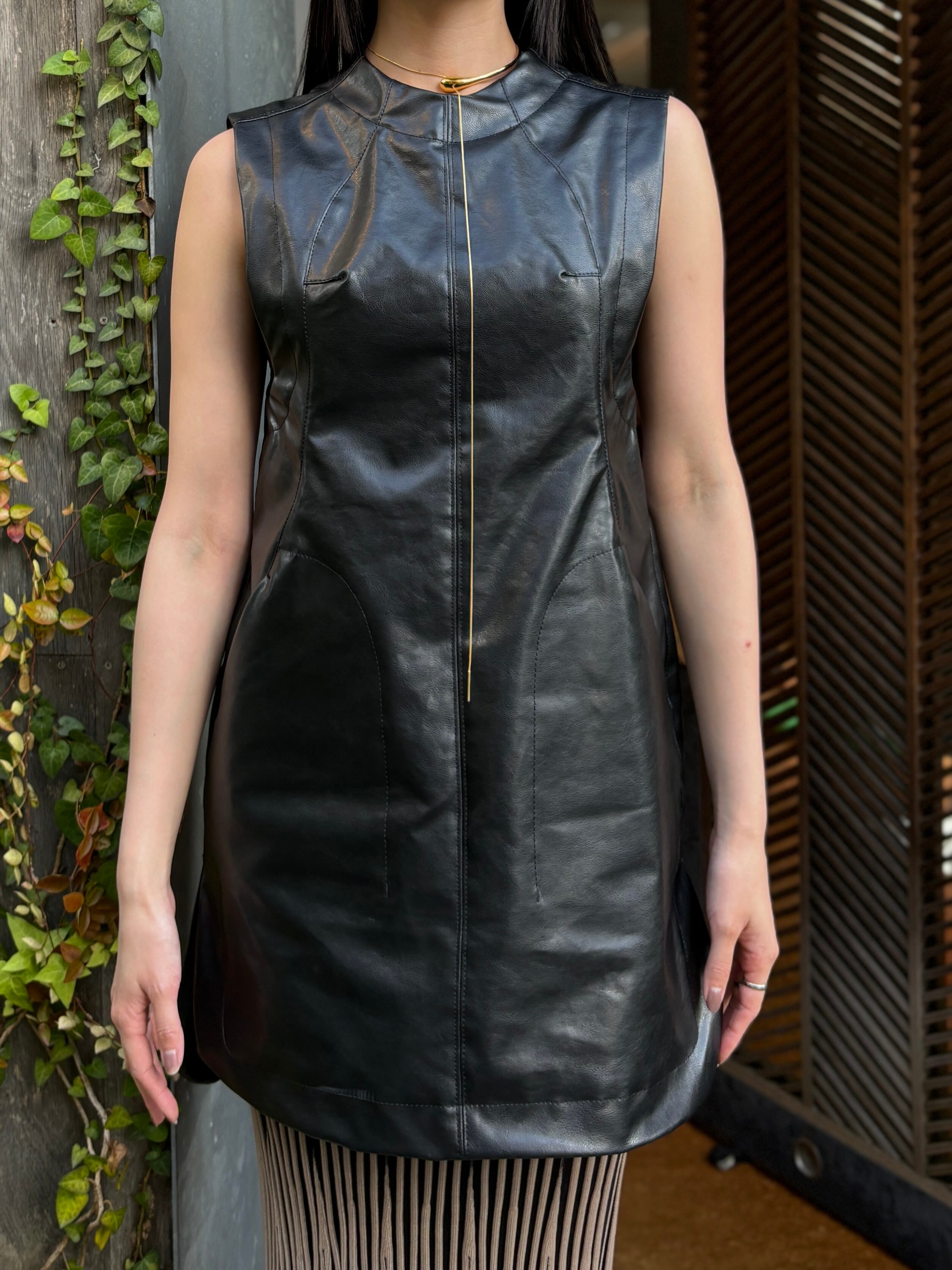 コットンギャバジンの生地にラミネート加工を施し、肌にあたる裏面をコットンにすることで心地よい肌触りを実現し、構築的なデザインでありながら着用し易い設計に。レザーのような質感に仕上げた光沢のあるトップスは、Iラインながらウエストを程よくシェイプすることでメリハリのあるシルエットが生まれ、アームホールにゆとりを持たせ、レイヤードしやすくシンプルなデザインが幅広いスタイルにフィットする1着に。