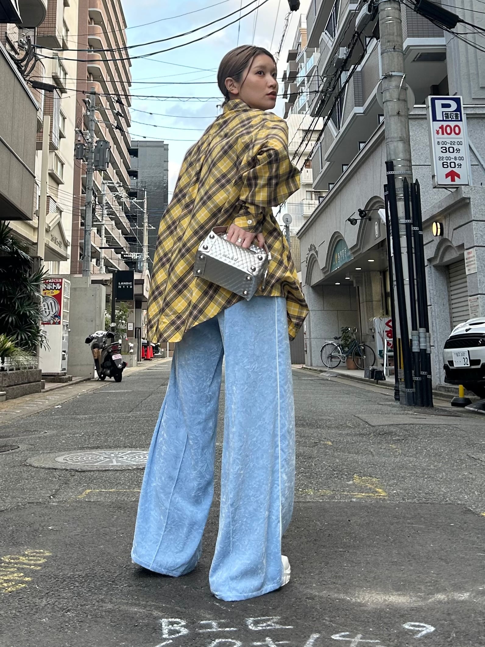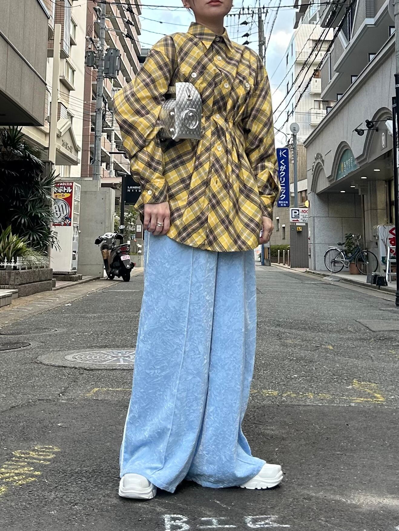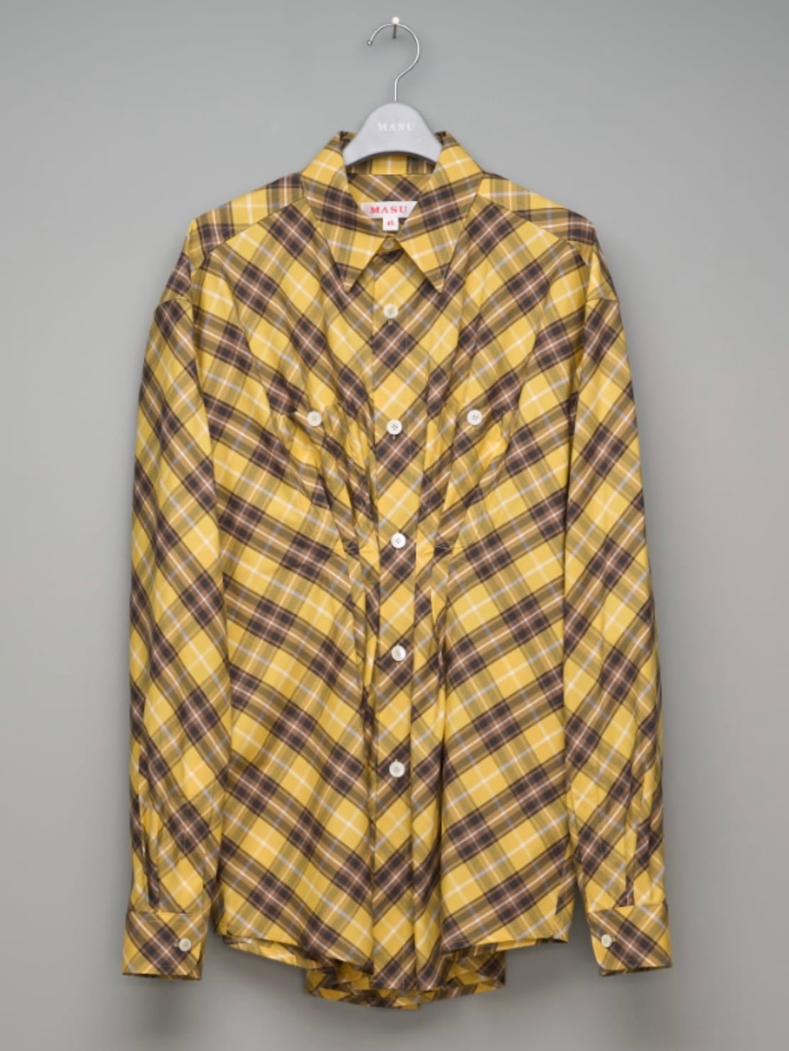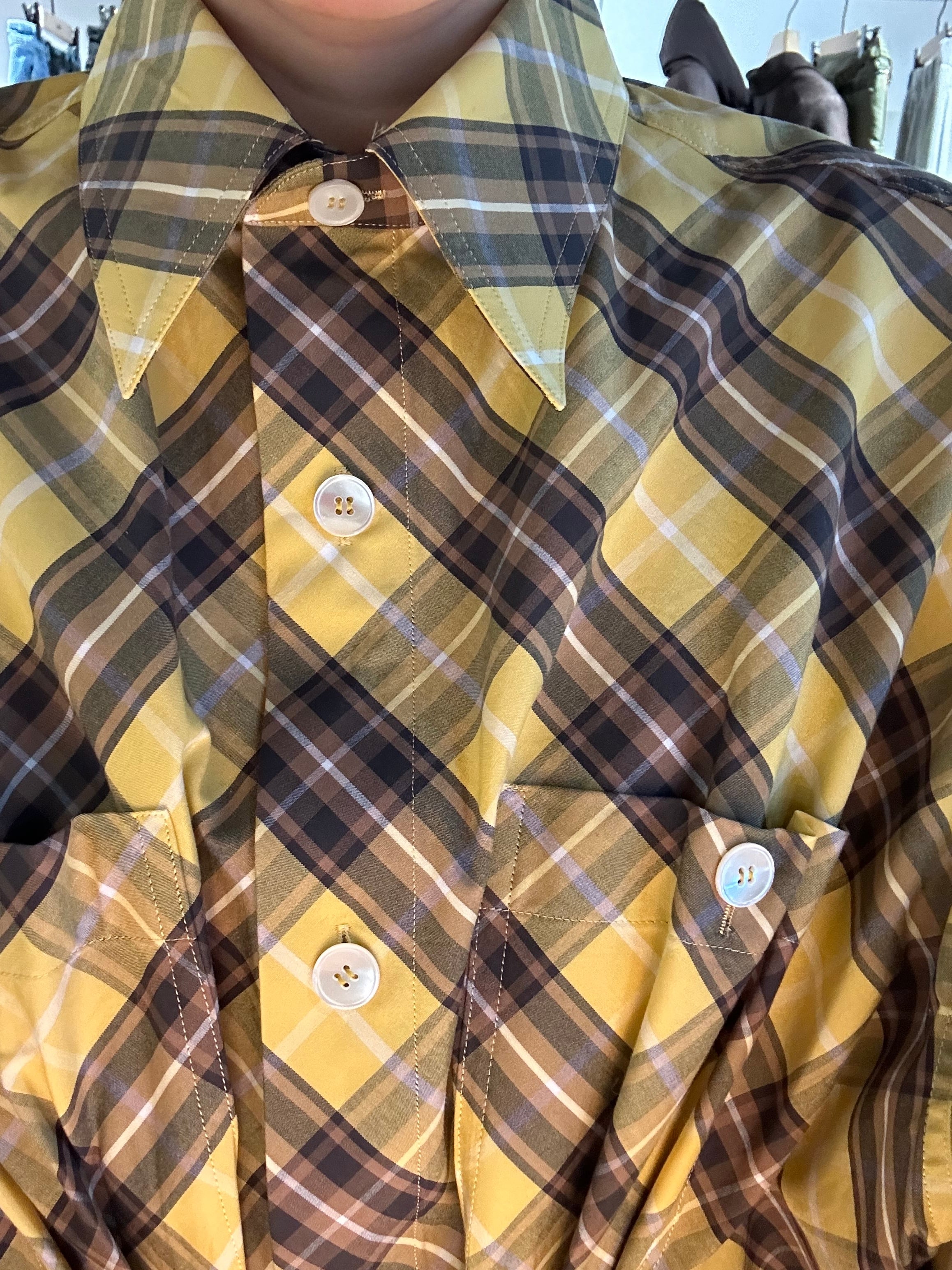 バイアスカットされたチェックシャツ。