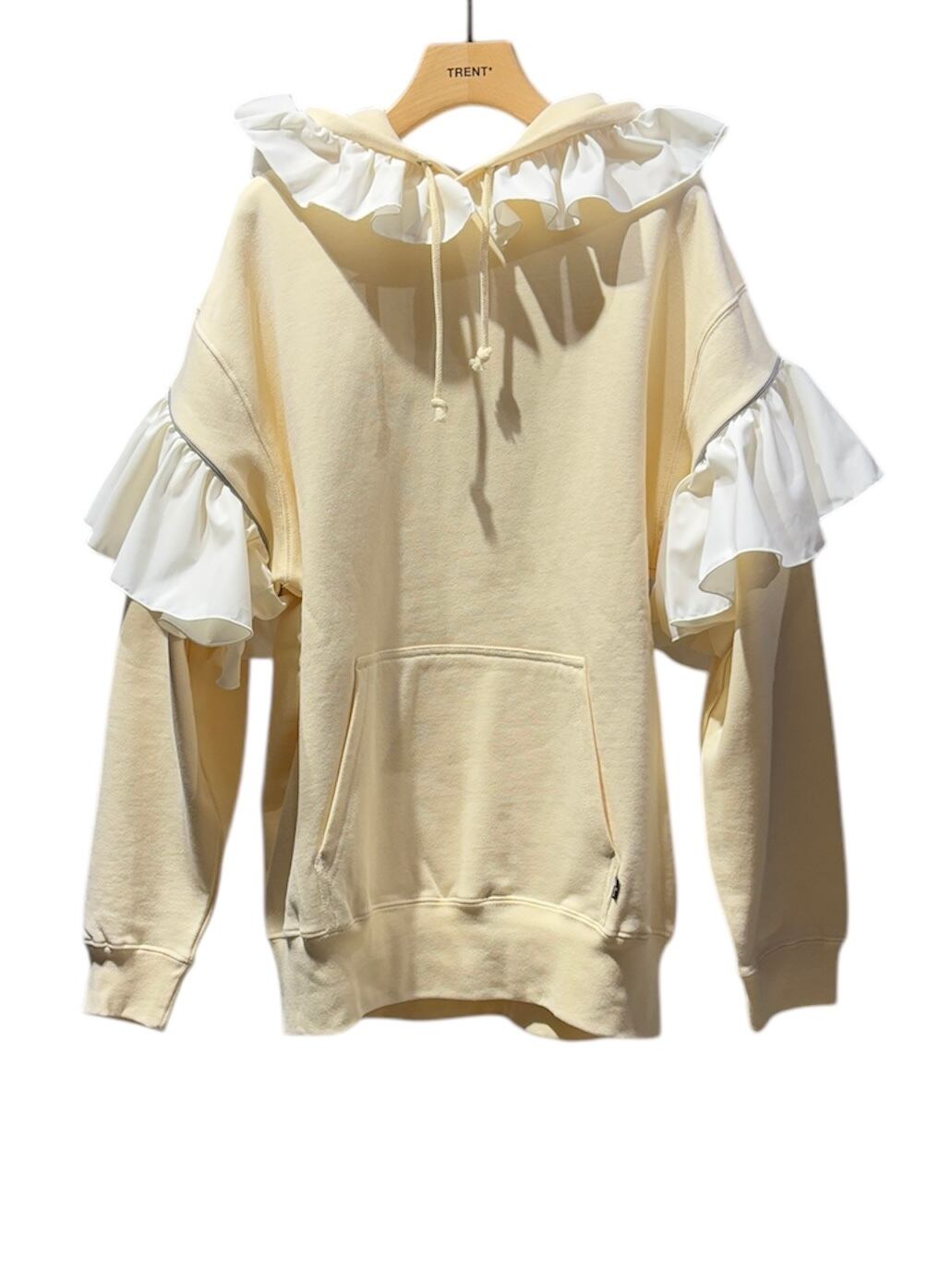 フリルが各所に散りばめられたプルオーバーフーディー。